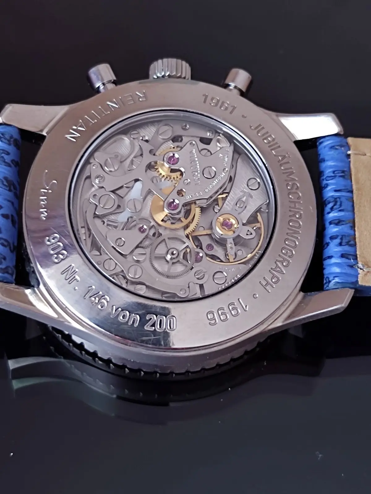 um es etwas genauer zu formulieren: es handelt sich um einen 903 Reintitan Jubiläumschronograph 1961- 1996. Sollte wohl in Serie gehen, gab aber laut Gerüchten Schwierigkeiten mit der Wasserdichtigkeit, deshalb wurde daraus kurzerhand ein Jubiläumsmodell mit dem seltsamen 35jährigen Jubiläum. 200 Exemplare , wobei es auch einige mit 24Std. Zifferblatt gab, genau wie viele kann ich nicht sagen. Bei diesem Exemplar scheint der Boden nicht original zu sein. Der sollte eigentlich so aussehen wie bei dem unteren gezeigten Exemplar.