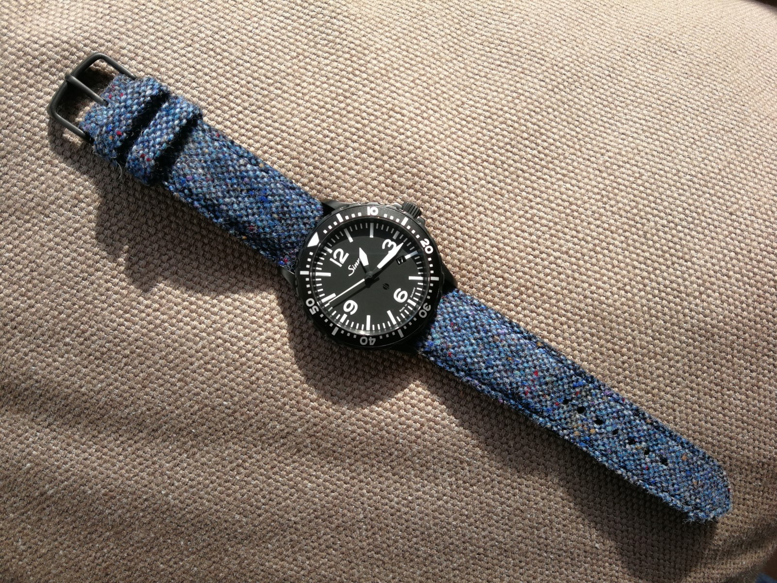 • Ich hatte mir das Teil zusammen mit 2 Bändern geholt und derzeit an meine Seiko Diver Spb 149 mit 40,5mm montiert. Die Bänder haben hier 20mm und kosten 12,95 €, ich habe mir hier dunkelblau und grau geholt. Sie sind etwas dünner als mir sonst bekannte Stoffbänder, fühlen sich aber sehr fest an, tragen sich leicht und angenehm.