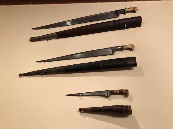 • Heute sind mal die Messer, Schwerter, Dagger an den Wänden im unteren Flur unseres Hauses dran. Soweit aus dem Ausland stammend, wurden diese alle "Vor-Ort" gekauft.