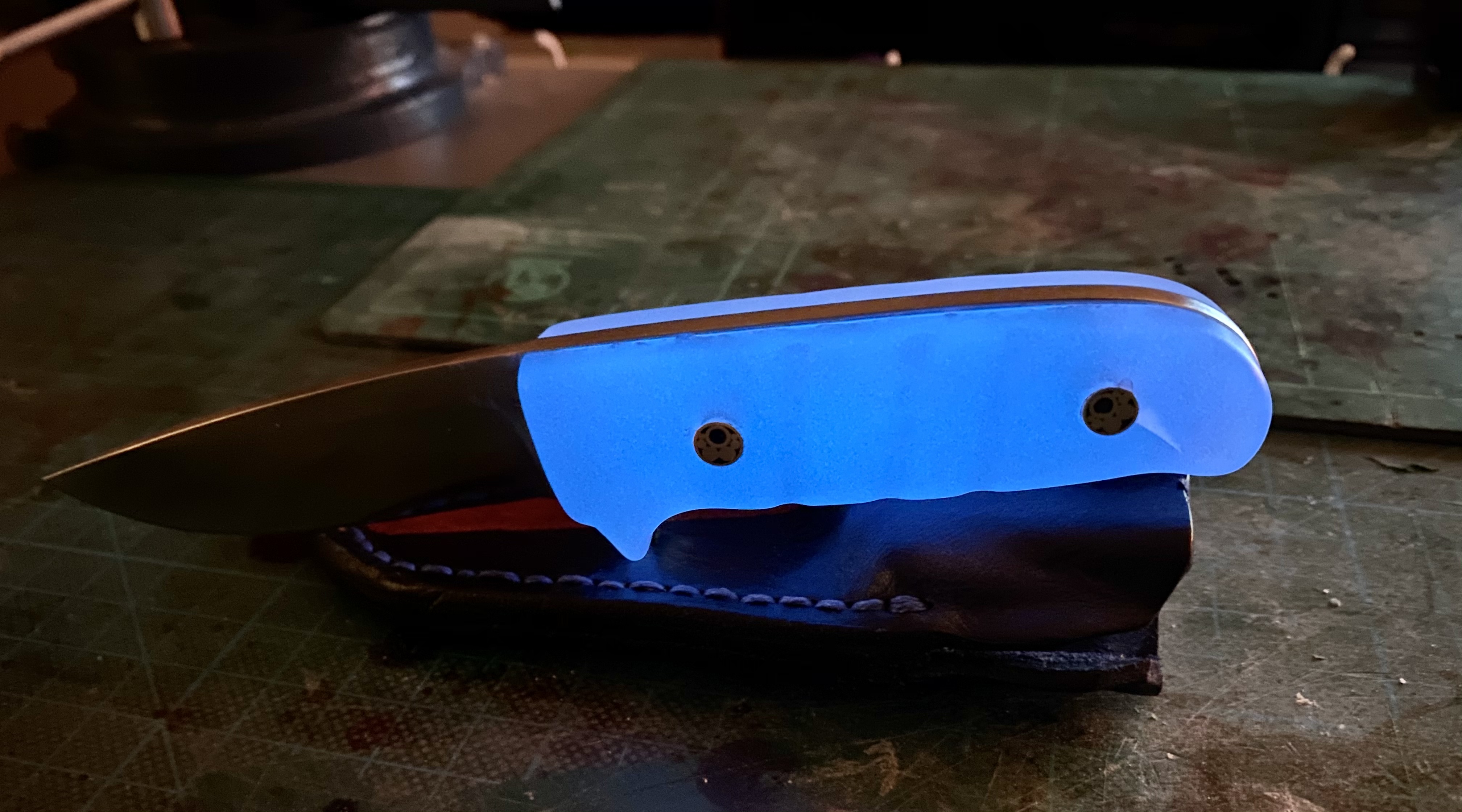 • Rechtzeitig vor meinem Arbeitsbeginn (nach dem Urlaub) ist mein Messer fertig geworden. Ich liebe es, wenn‘s im Dunkeln leuchtet.