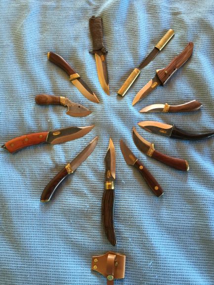 • Messer einer kleinen Messerschmiede namens Burza in Tiradentes/Minas Gerais/Brasilien, ca. 50 km von uns entfernt. ich habe in den letzten 15 Jahren mehr als 20 Messer dort gekauft. Diese sind handwerklich gut gemacht und man verwendet neben einheimischen Hölzern für die Griffe durchweg Stähle der österreichischen Firma Böhler. Entweder den K 100 Kohlenstoffstahl oder N 690 Rostträge.
