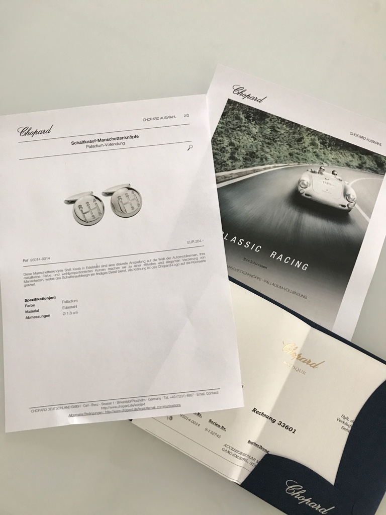 Diese Manschettenknöpfe habe ich im April 2012 in der Chopard-Boutique auf Sylt gekauft, und wollte sie meinem Mann zur Silber-Hochzeit schenken. Es kam leider nicht dazu...