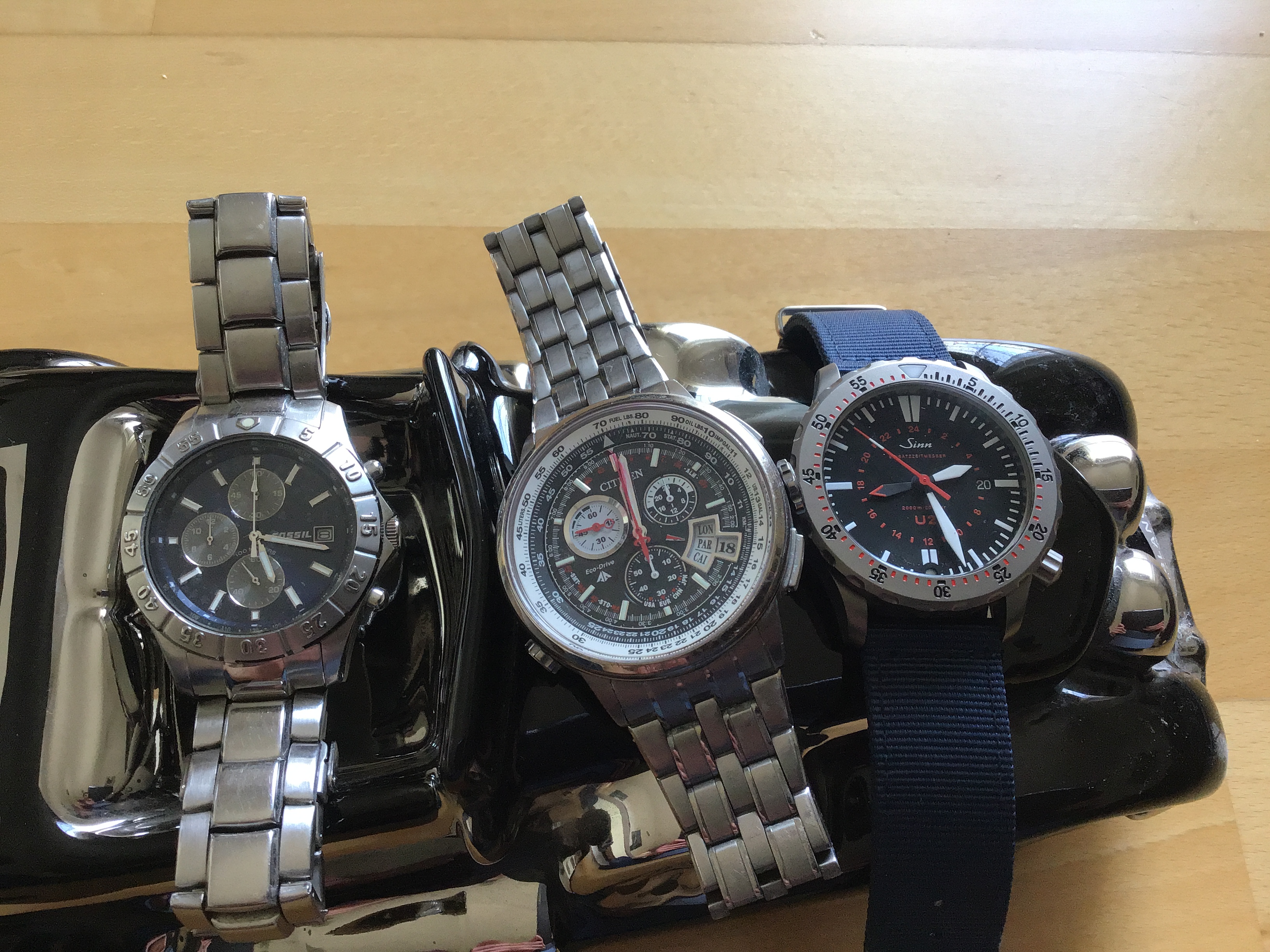 Nicht nur Für Frankfurter gehört eine Sinn in jedem anständigen Haushalt. Die 900 Flieger hat ein gehärtetes Gehäuse, einen Chrono und eine bewegliche Lünette für die Zeitmessung, sieht gut aus und trägt sich großartig und ist sozusagen DER daily rocker. Ich habe sie sogar zum Tauchen benutzt (da ich keine richtige Taucheruhr mehr besitze).
