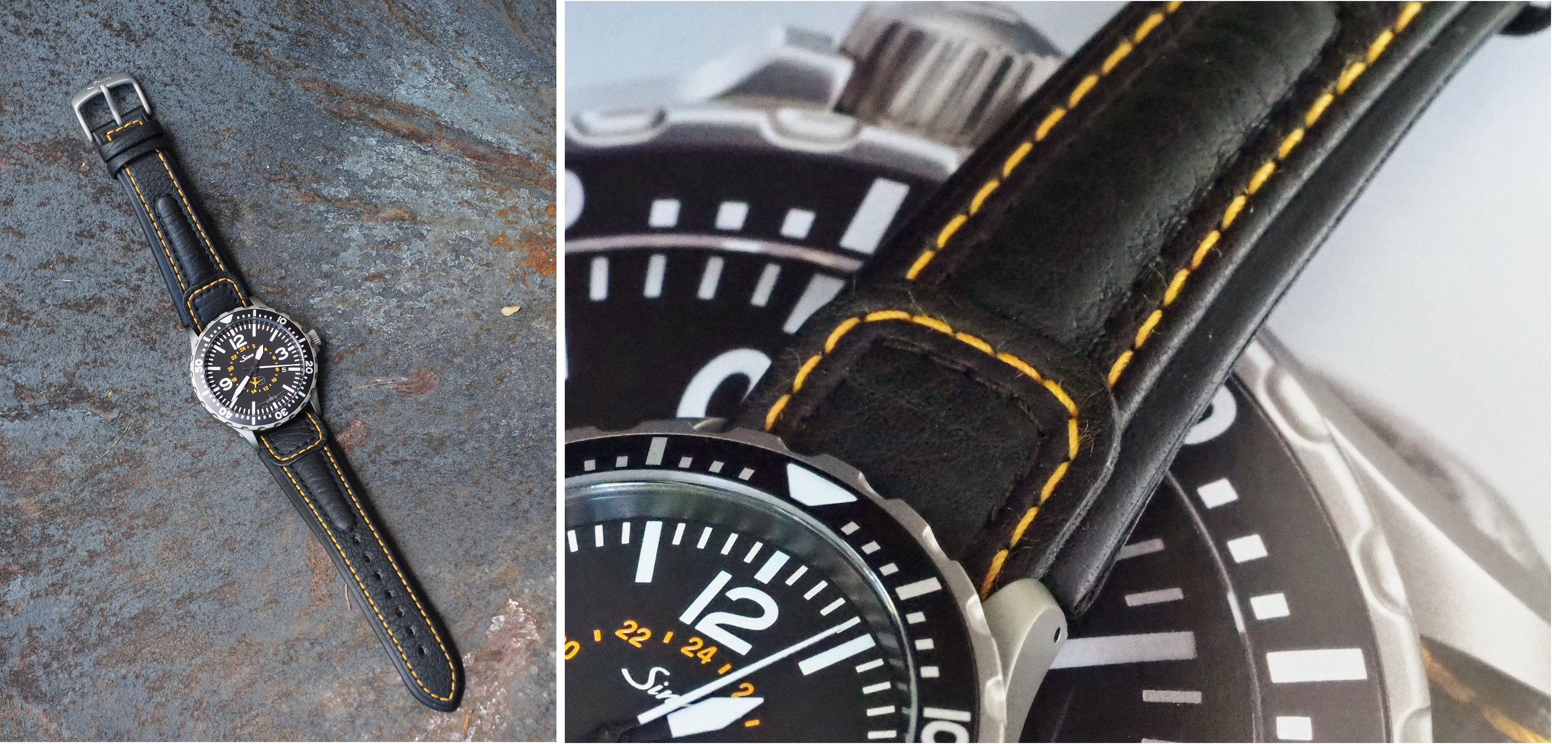 Da die Nähte des Bandes sich farblich auf die Farbe des 24 Stunden UTC des Zifferblattes stützt ist sicher KEIN Zufall, hier fallen zwei Dinge zusammen, die auch zusammen gehören.