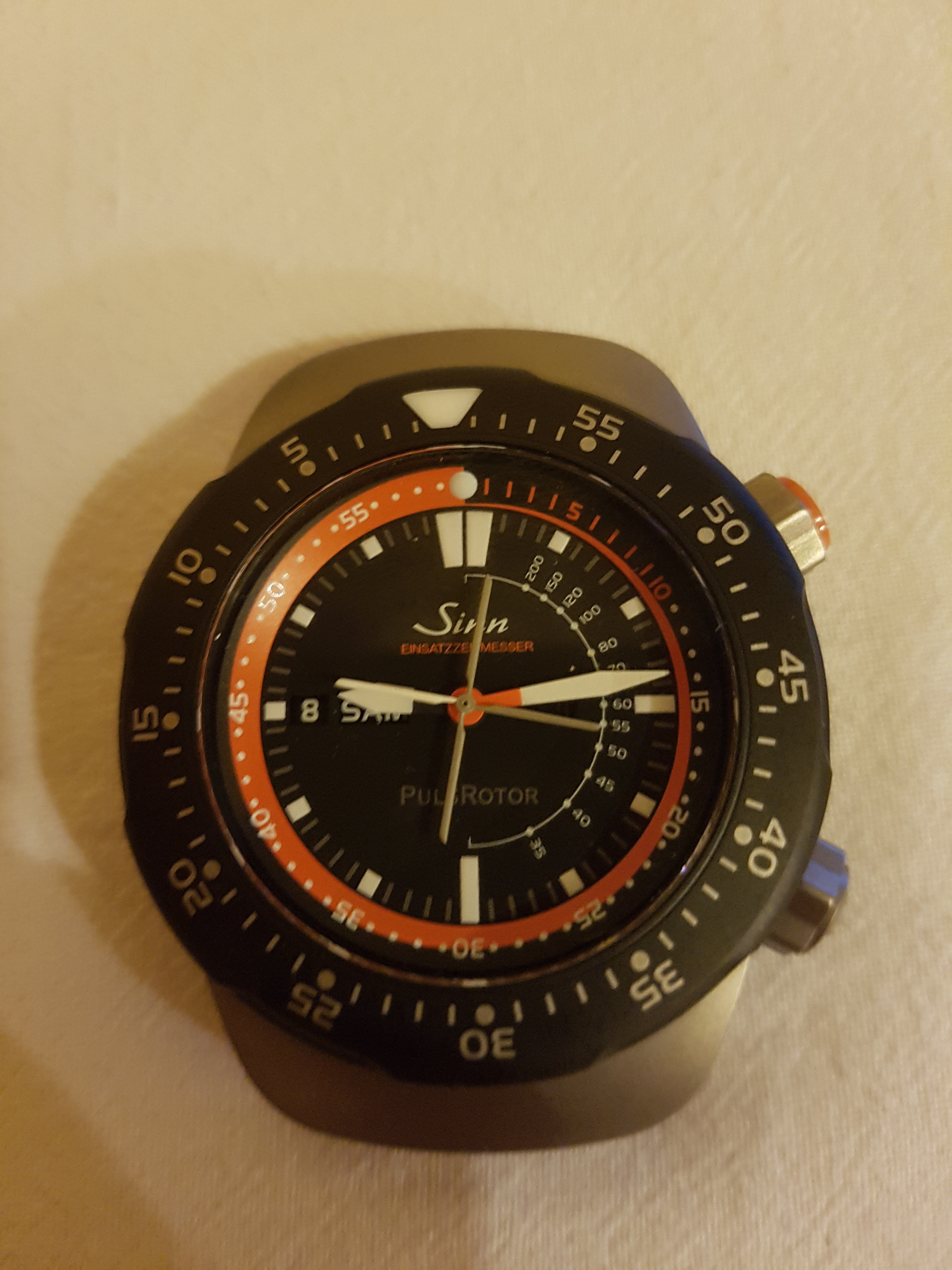 Gratuliere! Ich konnte mir den EZM 12 gestern erstmalig in natura anschauen. Das Gehäuse finde ich sehr ansprechend. Es erinnert mich vom Design her an die F1-Serie von TAG HEUER, wobei das Gehäuse der SINN deutlich hochwertiger ist. Laut dem neuen Verkaufsberater im Füldchen hätte Herr Schmidt das Patent zum eingehakten Silikon-Armband bereits vor vielen Jahren bei IWC erlangt und nun umgesetzt. Die Uhr wird sicher am Arm unverlierbar sein, aber win etwas "komisches" Gefühl bleibt dennoch, wenn man weiß, dass das Armband "nur" in den Federstegen eingehakt ist. Freilich lassen sich auch konventionelle Bänder an der Uhr montieren, z. B. das dünnere SINN-Silikonband mit Dornschließe und geradem Anschlag.