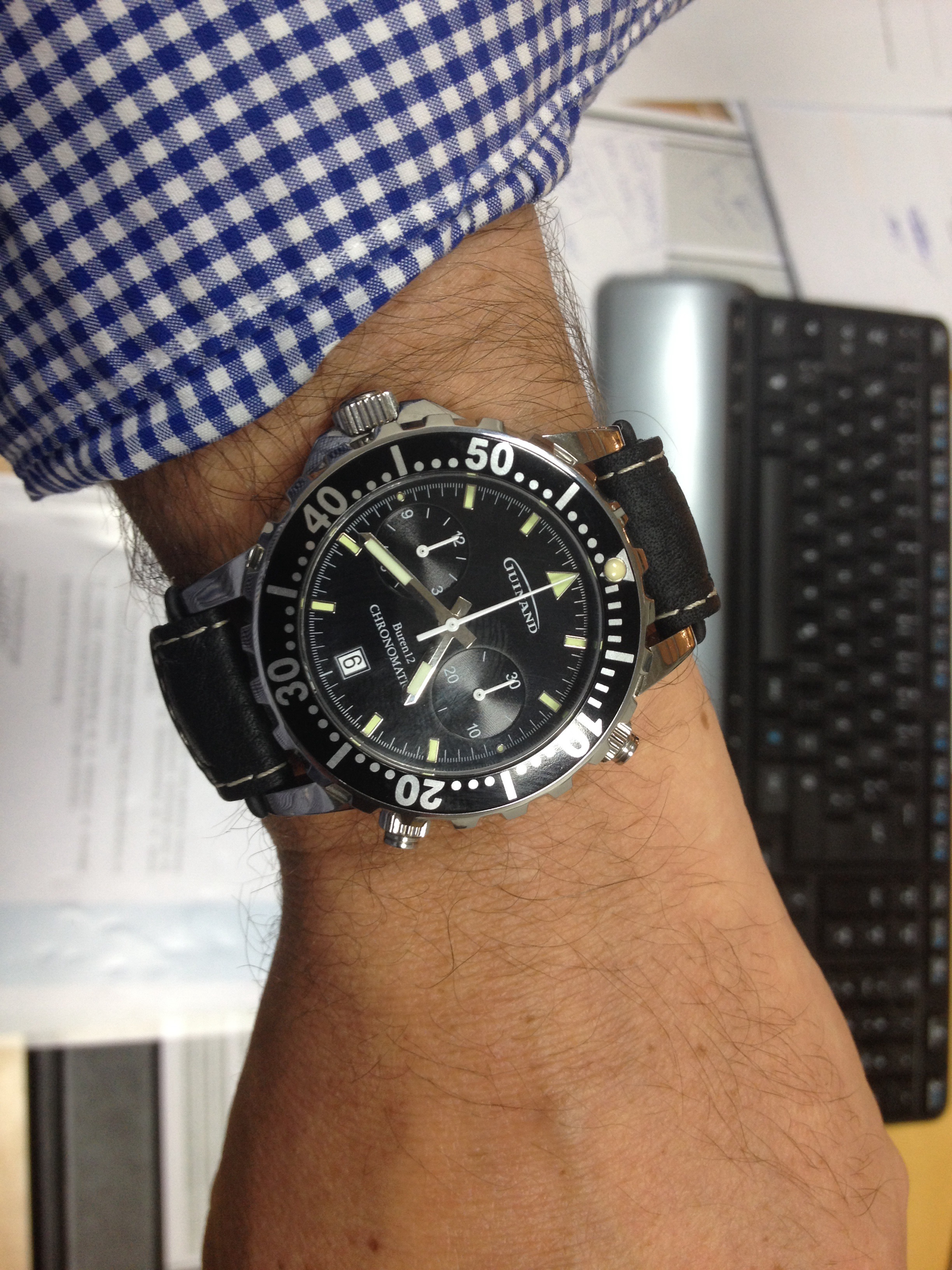 Früher fann ich das auch fürs Auge ungewohnt. Heute lässig, angenehm zu tragen und gut in dee Bedienung der Chronodrücker