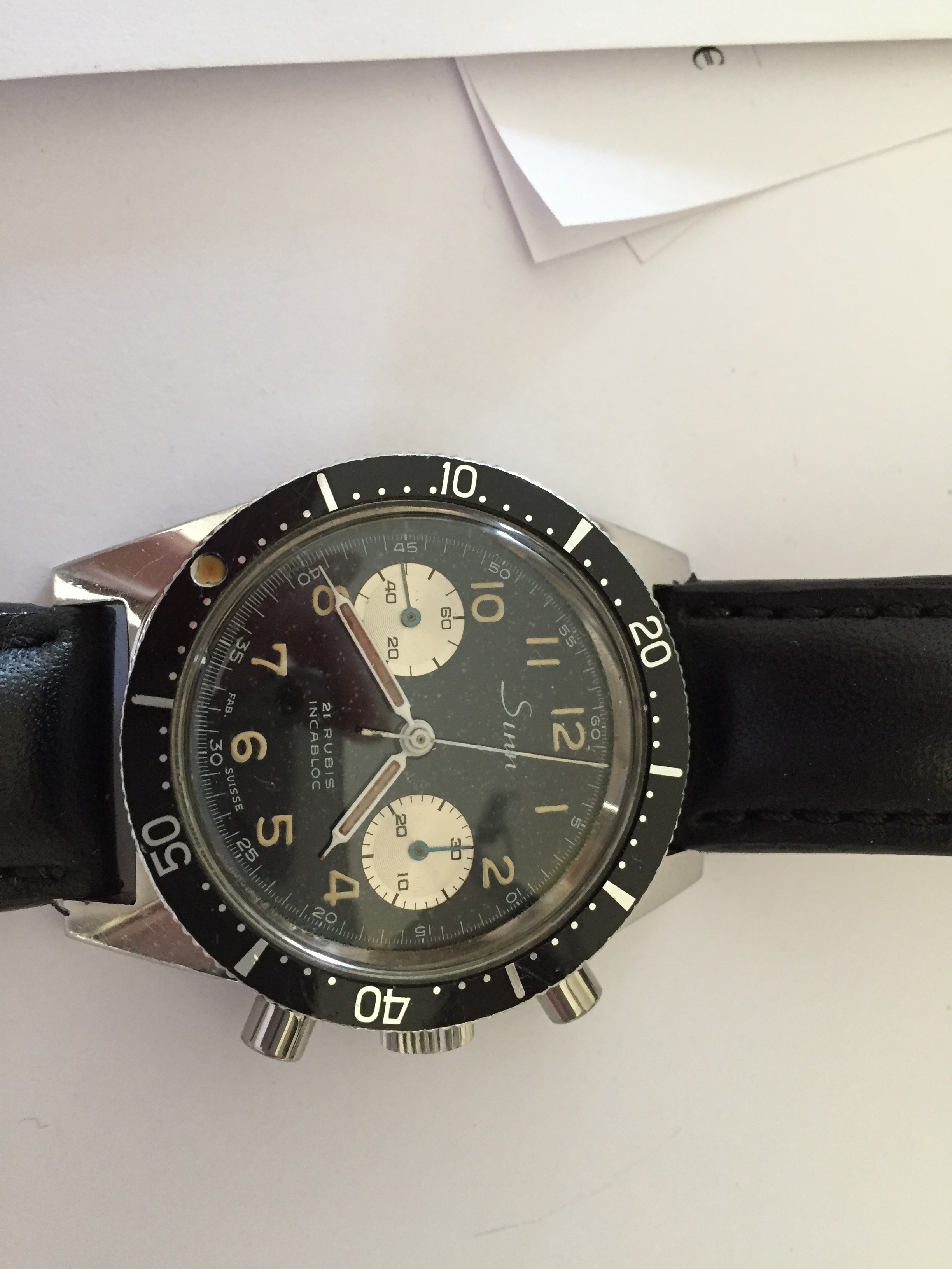 Anfang 2018 bin ich mit dieser Uhr nach Frankfurt zur Fa. Sinn gefahren und wollte die Uhr (sie läuft und läuft und läuft…) von grund auf „renovieren“ lassen. Ein freundlicher und offensichtlich sachkundiger Herr (Kunde der Fa. Sinn) hat mir dort davon abgeraten und empfohlen die Uhr im Originalzustand zu belassen. Auch Vertreter der Fa. Sinn haben dies empfohlen, da beim „Überholen“ die Gefahr besteht, dass z. B. die Zeiger abbrechen und kaum noch Originalersatzteile vorhanden sind.