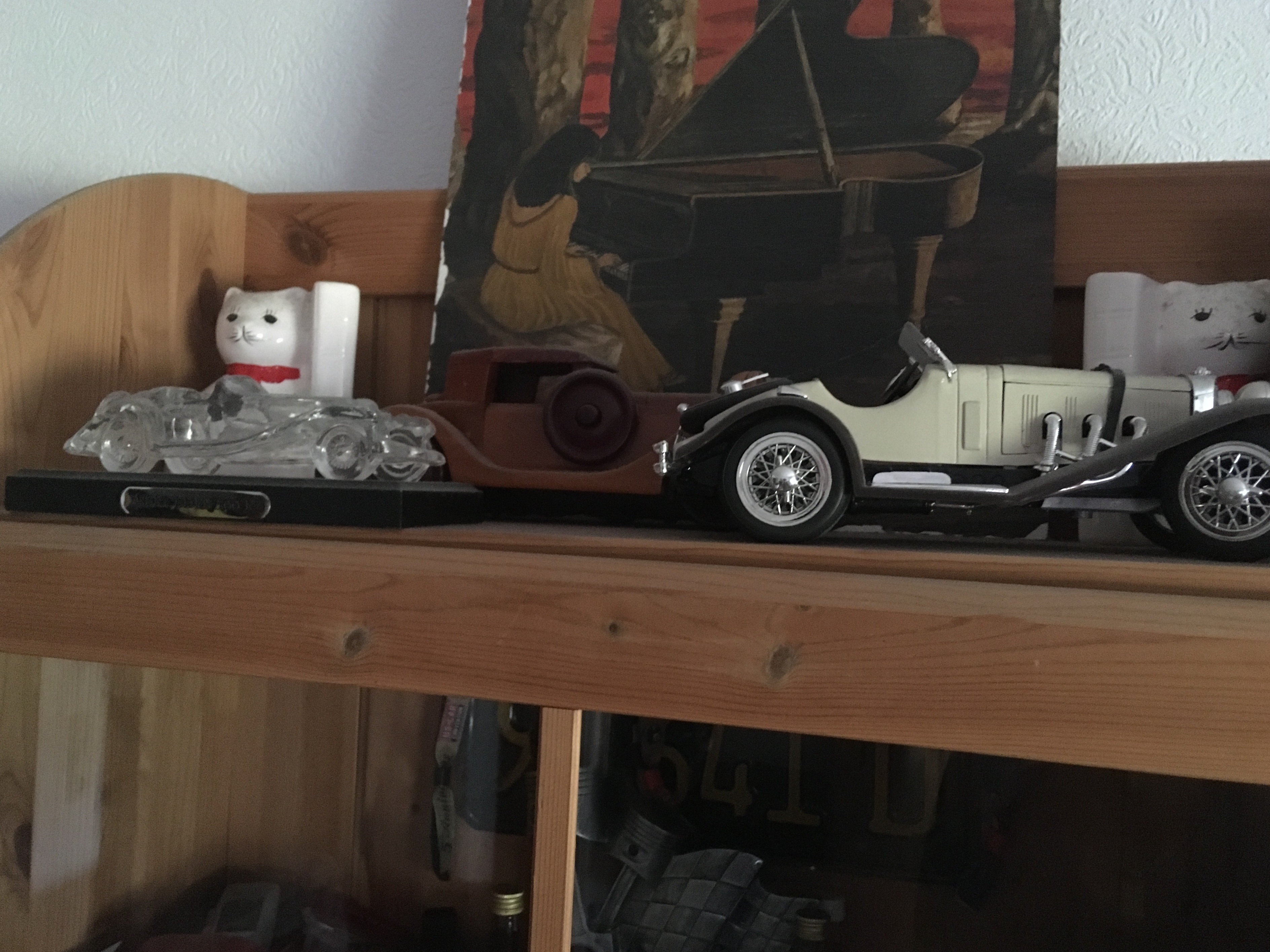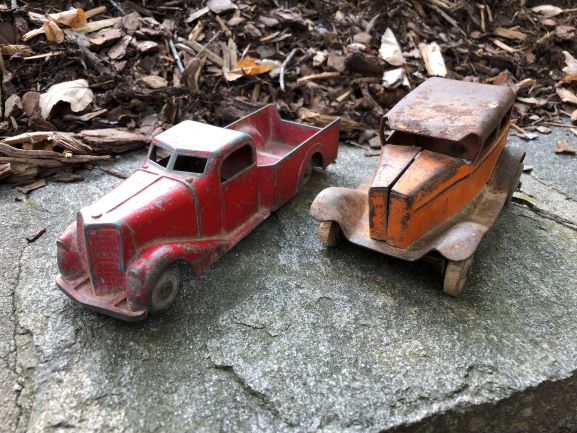 2018 konnte ich in Asheville/NC nicht nein sagen, als ich die beiden gut bespielten antiken Blechfahrzeuge aus den 1940er/1950er Jahren in einem Pawn Shop fand und mitnehmen mußte. Sie haben irgendwie eine starke Ausstrahlung und erzählen ihre Geschichte. Größe zwischen 12 und 18 cm.