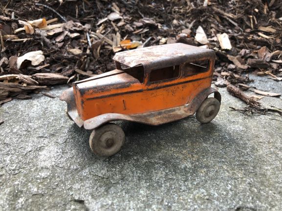 2018 konnte ich in Asheville/NC nicht nein sagen, als ich die beiden gut bespielten antiken Blechfahrzeuge aus den 1940er/1950er Jahren in einem Pawn Shop fand und mitnehmen mußte. Sie haben irgendwie eine starke Ausstrahlung und erzählen ihre Geschichte. Größe zwischen 12 und 18 cm.