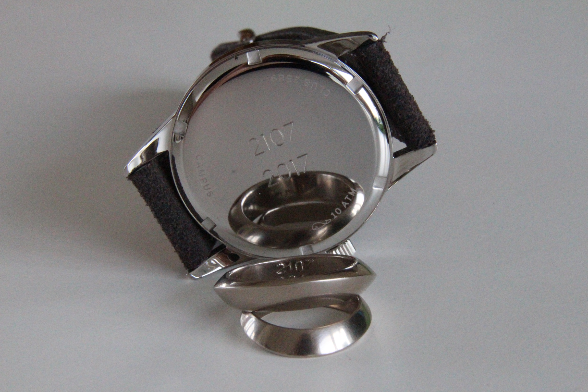 Graviert mit dem Datum, leicht grafisch, so wie auf der Hochzeits-Nomos auch.