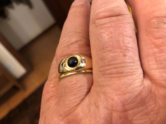 Es fehlen noch ein ganz schmaler Ehering sowie ein Saphir-/Brillantring am linken Ringfinger. Den Ring mit den Steinen trage ich bereits seit über 40 Jahren, unser Ehering ist von einem sehr bekannten brasilianischen Designer/Goldschmied aus 18 k Gelbgold gefertigt. Das Band dreht sich einmal 360° um seine eigene Achse.