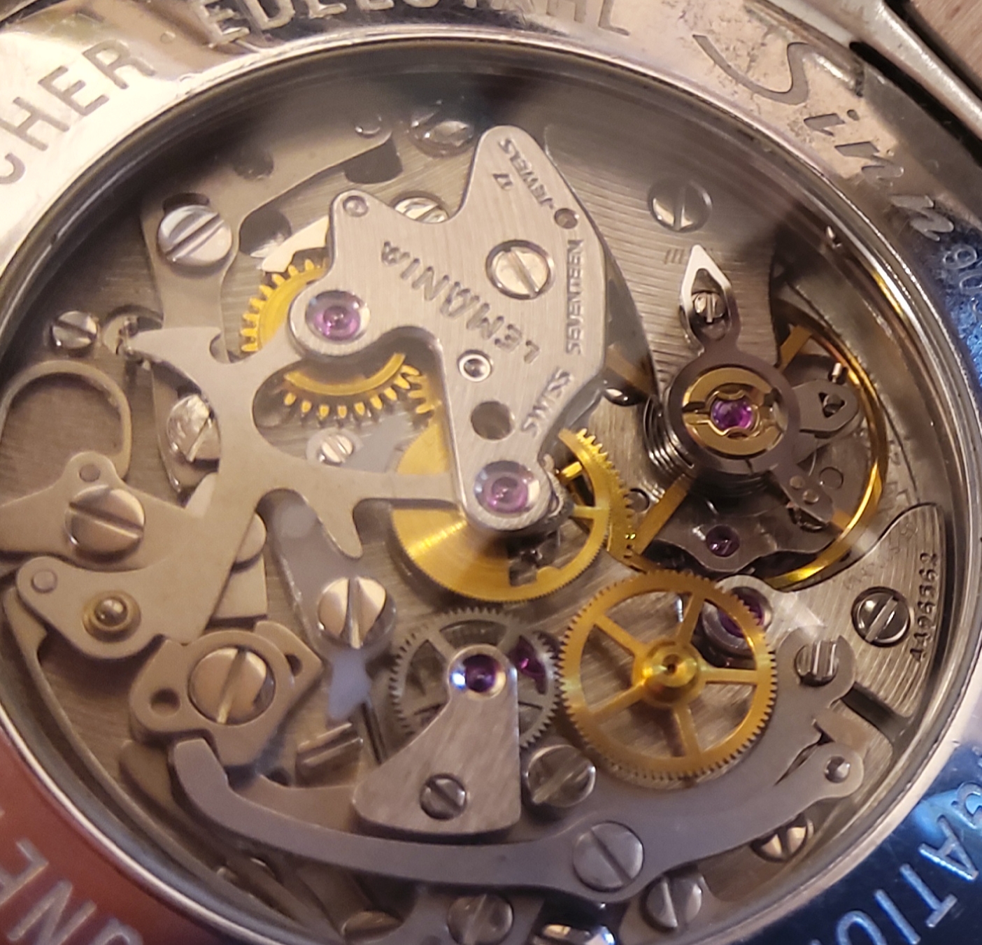 Mit der Lupe kann man mehr sehen, auch ein Stück der 8 und der 7, alles sehr vom Unruhreif und einem weiteren Bauteil verdeckt, wenn man die Uhr in einem flachen Winkel hält, geht es.