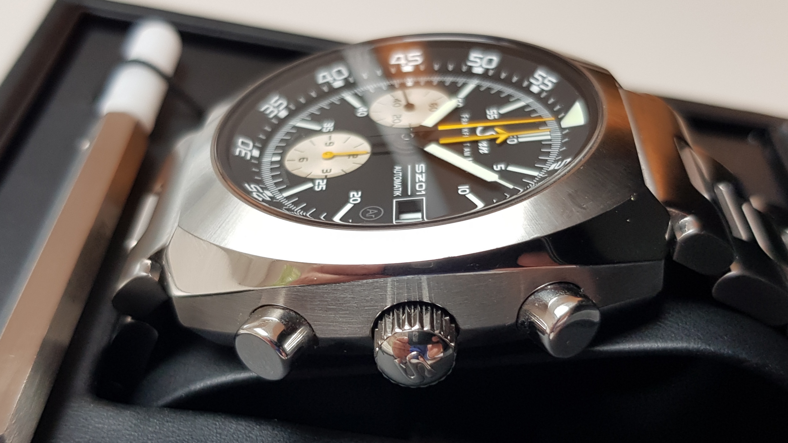 Die Uhr stammt aus 2013, wurde von mir als zweitem Besitzer selten und im Wechsel mit einigen anderwn Uhren getragen. Durch einen Zufall bin ich vor einigen Monaten in den Besitz einer zweiten gelangt und trenne mich daher nun von meiner Ersten, die ich seit ca. 2 Jahren habe.