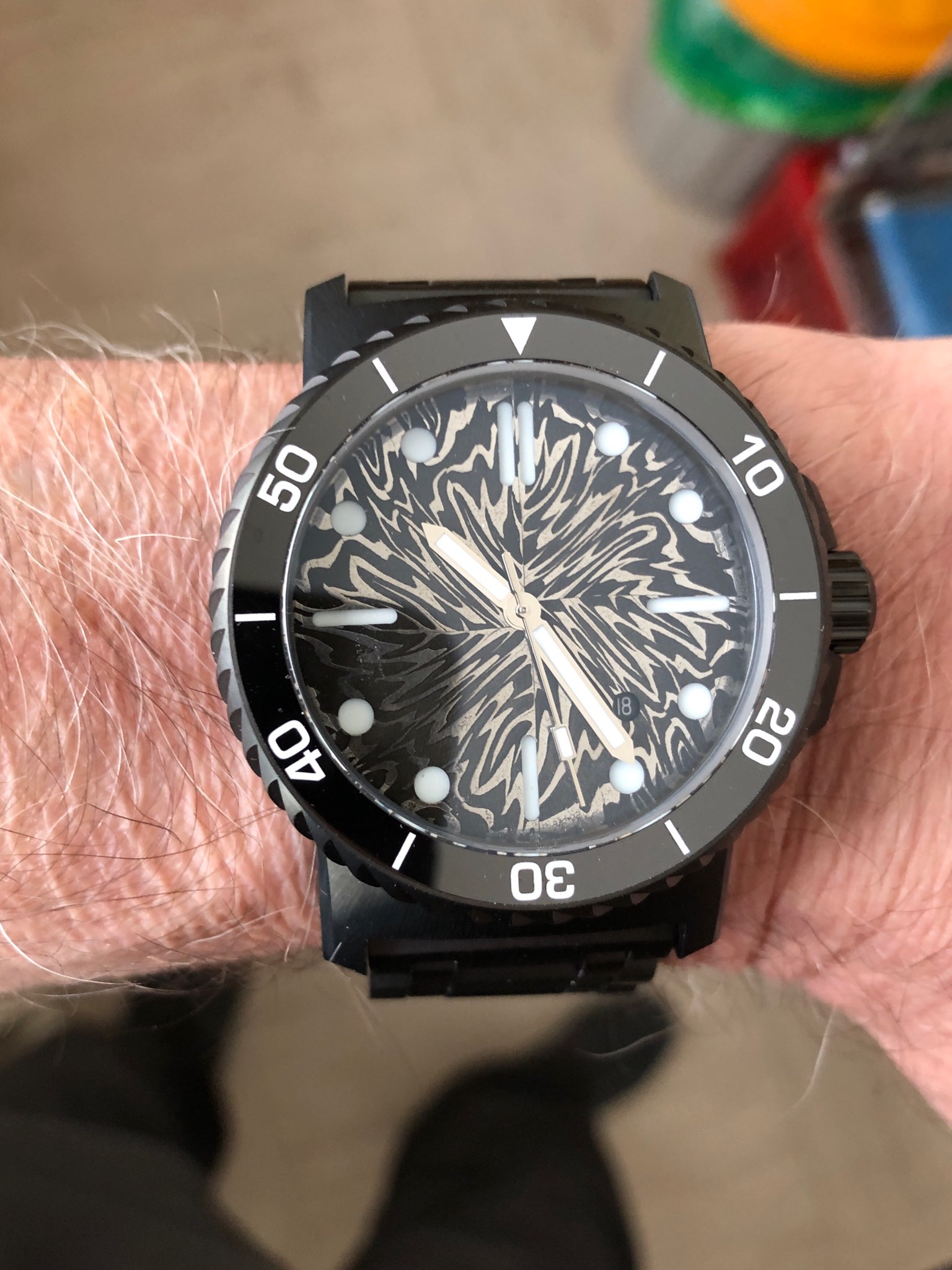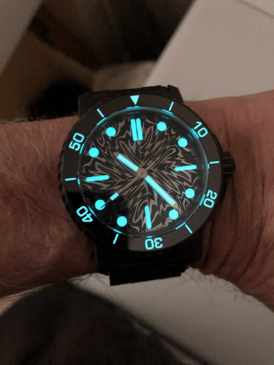 Die Uhr baut zwar technisch bedingt ein "wenig" hoch (wahlweise sind 2 verschieden hohe Saphirgläser bestellbar), ist mit 44mm Durchmesser und 126g dank Titangehäuse jedoch kein Monster, imo sogar sehr schick, insbesondere mit der DLC-Lünette an Kautschuk!