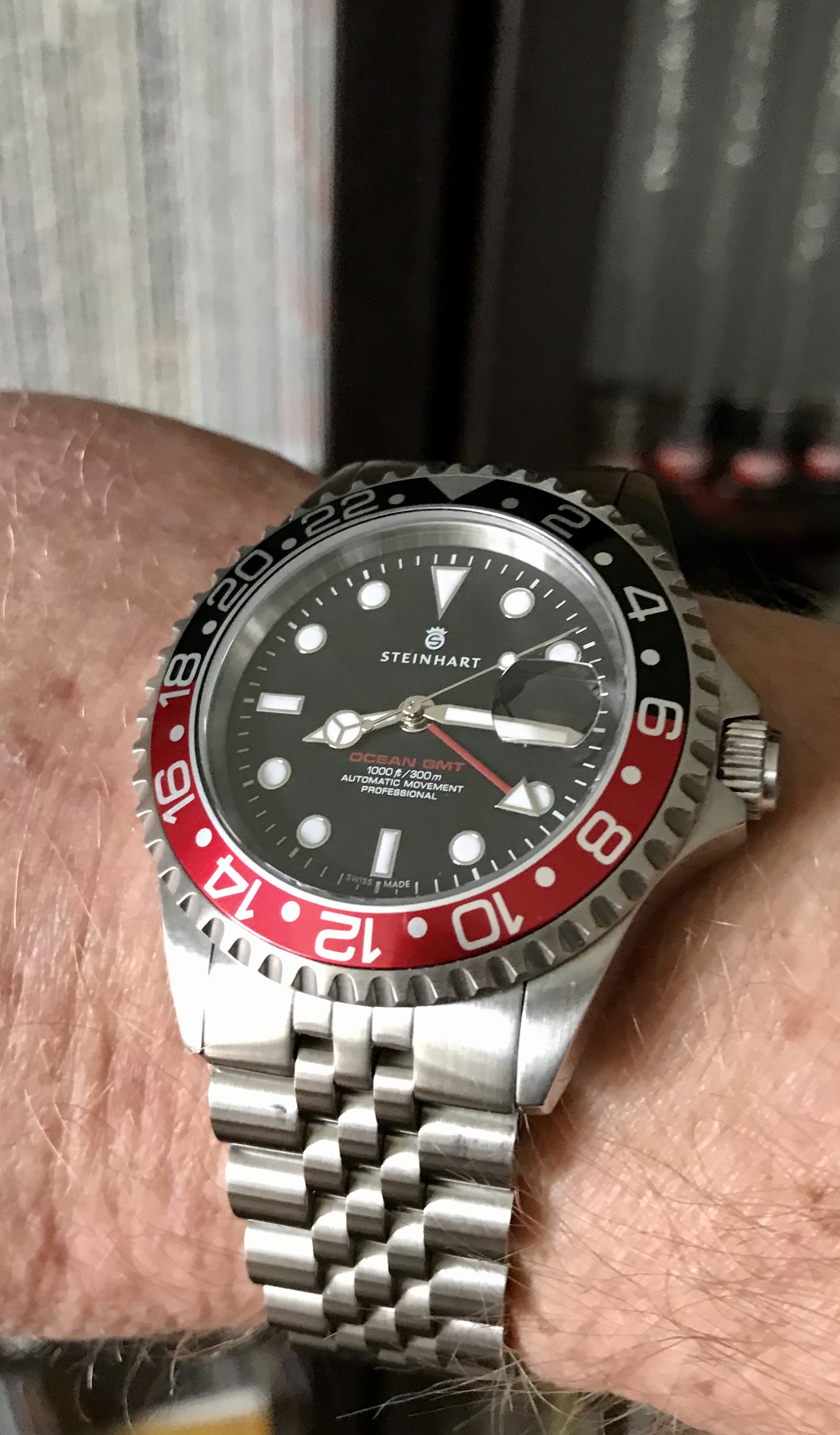 So hatte ich mir bei Gnomon eine Steinhart Ocean One GMT Black/Red mit Jubilee-Band bestellt. Dieses Kombination wird exklusiv für Gnomon angeboten.