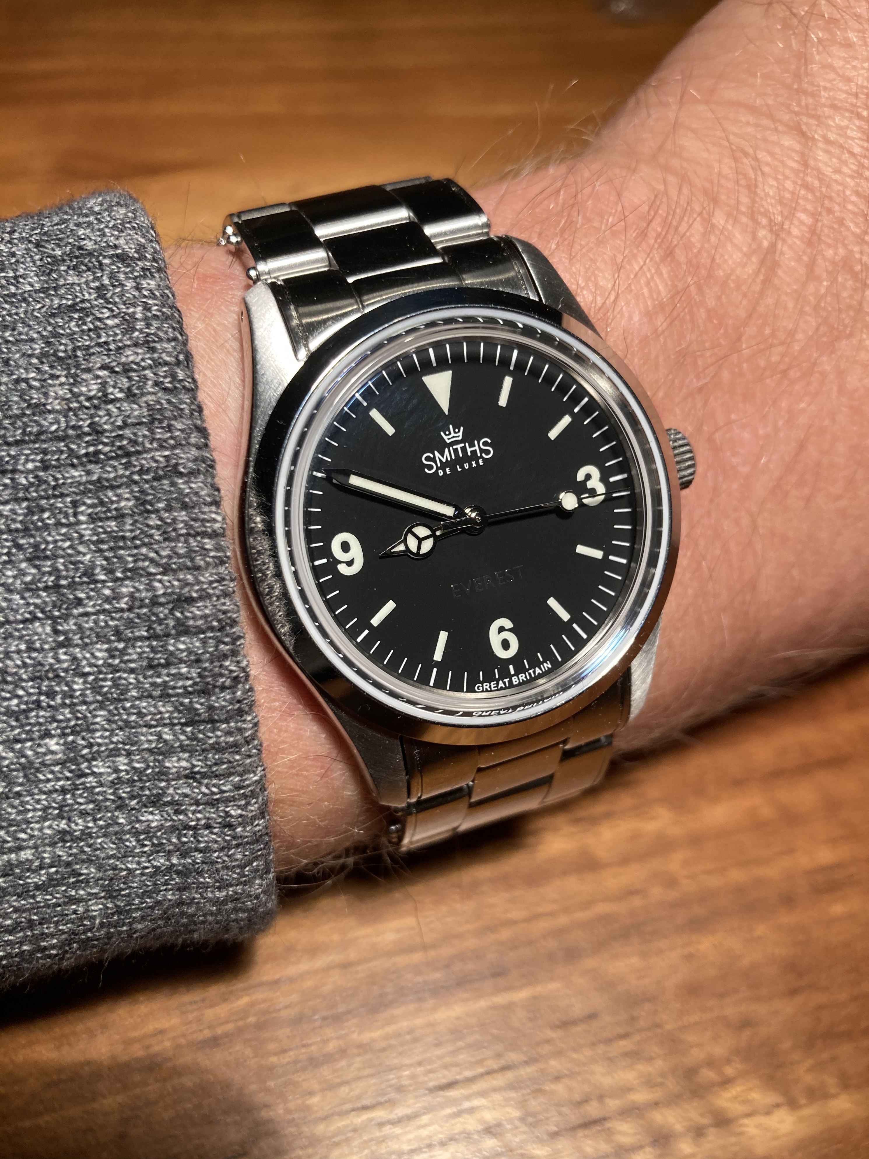 Marken-/Uhrenvorstellungen gehören vermutlich nicht zu meinen Stärken, das können andere 1000x besser. Allerdings weiß ich ich das Smiths damals wohl auch ein angesehener Britischer Uhrenhersteller war. Anscheienend herrschte sogar ein bitterer Streit zwischen Rolex und Smiths hinsichtlich der Frage welcher Hersteller die erste Uhr auf der Spitze des Mount Everest hatte mit Edmund Hilary und Tenzing Norgay. Rolex soll dies scheinbar immer für sich beansprucht haben, aber es gibt wohl auch Stimmen die dem wiedersprechen. Wen es interessiert, kann ja mal HIER reingucken. Ich fand es interessant zu lesen. Nachdem Eddie Platts (von Timefactors) in den neunzigern die Markenrechte an Smiths übernahm, brachte er eine Hommage an die Rolex 1016 heraus (selbst besizt er übrigens die echte 1016) Seine Hommage ist mittlereweile auch sehr beliebt und man kann sie nur mit ein bisschen Glück bestellen. Alle paar Wochen/Monate öffnet er seinen online Laden und innerhalb von 3-4 Minuten sind alle ausverkauft. Ich hatte letztens also Glück. Die Uhr kam standard mit Stahlband, aber ich habe mir sofort ein von Hand gemachtes vintage Horween-Band dafür bezorgt, damit es noch mehr erinnert and die damalge Zeit. Ich muss allerdings sagen, dass die Uhr am Stahlband minstens genau so gut aussieht. Ich habe nun beschlossen, dass ich ihr im Winter das Lederband verpasse und im Sommer wenn wieder geschwitzt wird, kommt das Stahlband wieder dran,