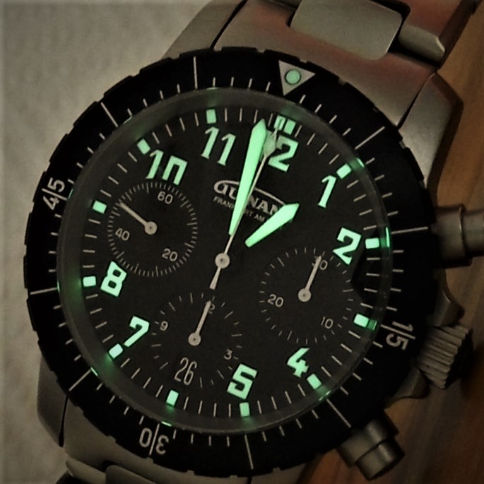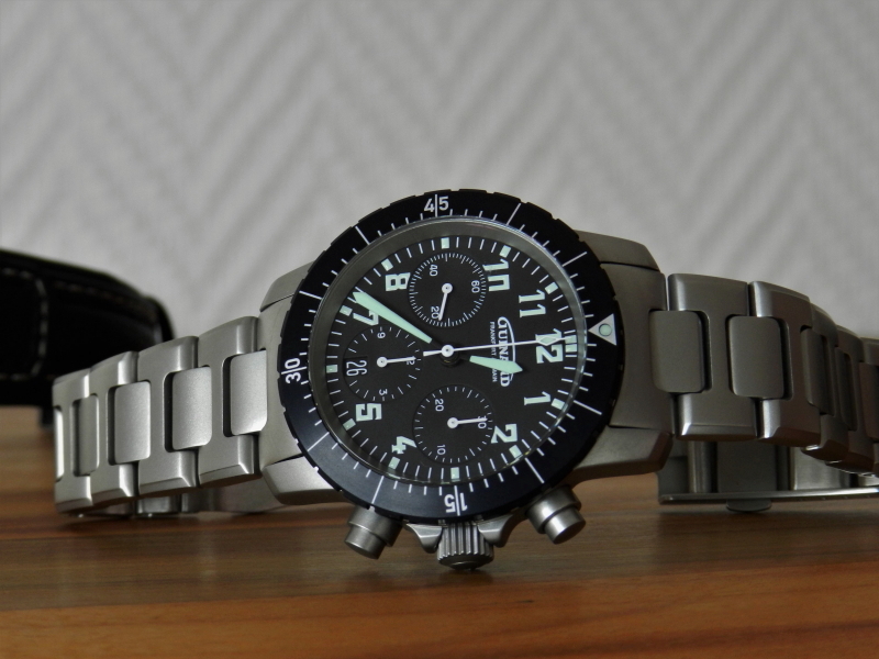 Der neue Flieger-Chrono hat mir gleich sehr gut gefallen und mit der Sonderanfertigung " Grün" konnte ich quasi beide Uhren in einer verbinden, aber vor allem mit Tricompax . Grün steht übrigens für grüne Leuchtmasse, analog zum Duograph-Flieger.