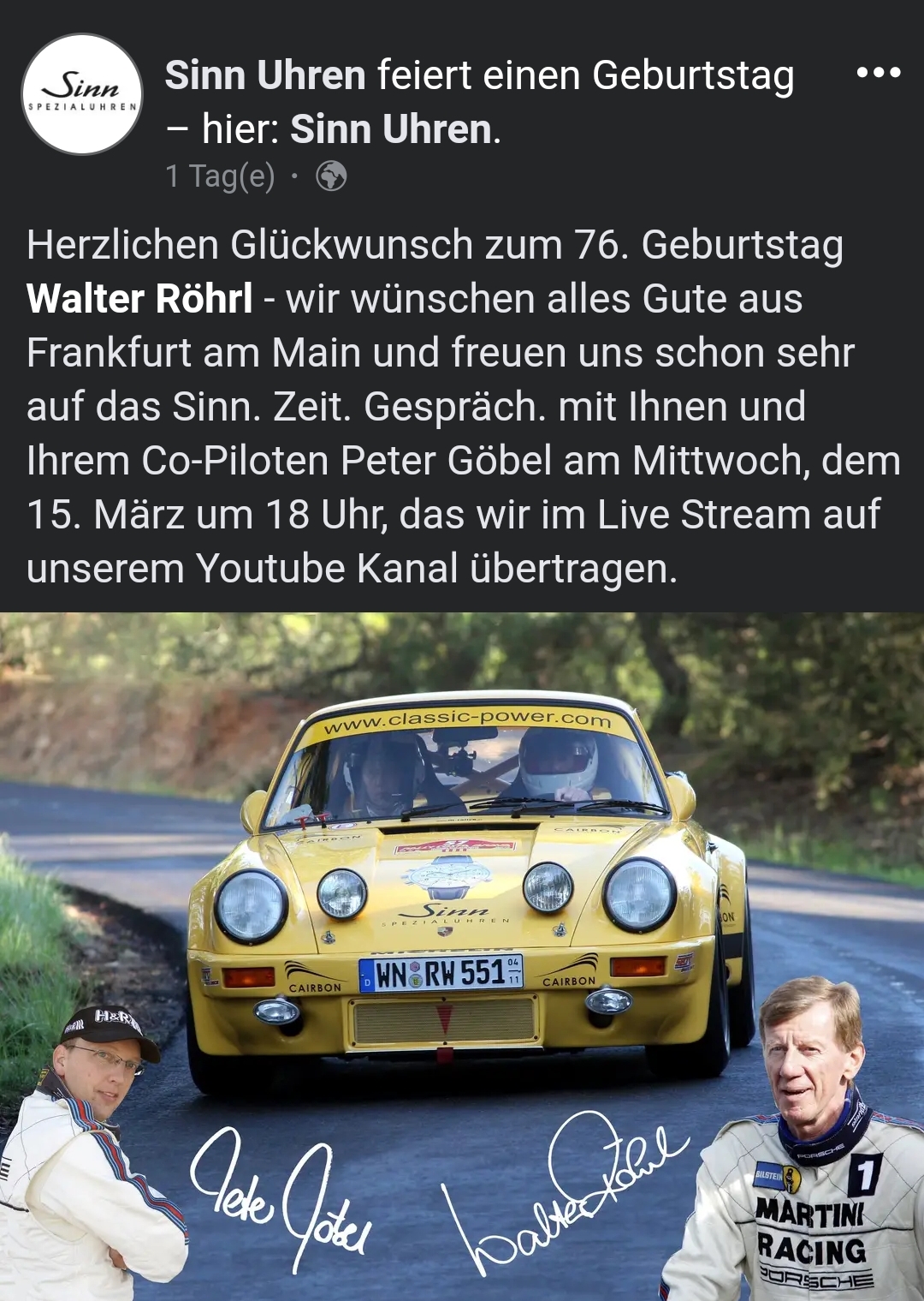 Rasant wird es am 15. März 03. April 2023 beim Sinn. Zeit. Gespräch. zum Thema "Zeitmessung im Rallyesport". Zwei Experten berichten, worauf es bei der Zeitnahme im Rallyesport ankommt und warum gerade mechanische Sinn-Uhren eine wichtige Rolle spielen, wenn es um Präzision und Zuverlässigkeit geht.