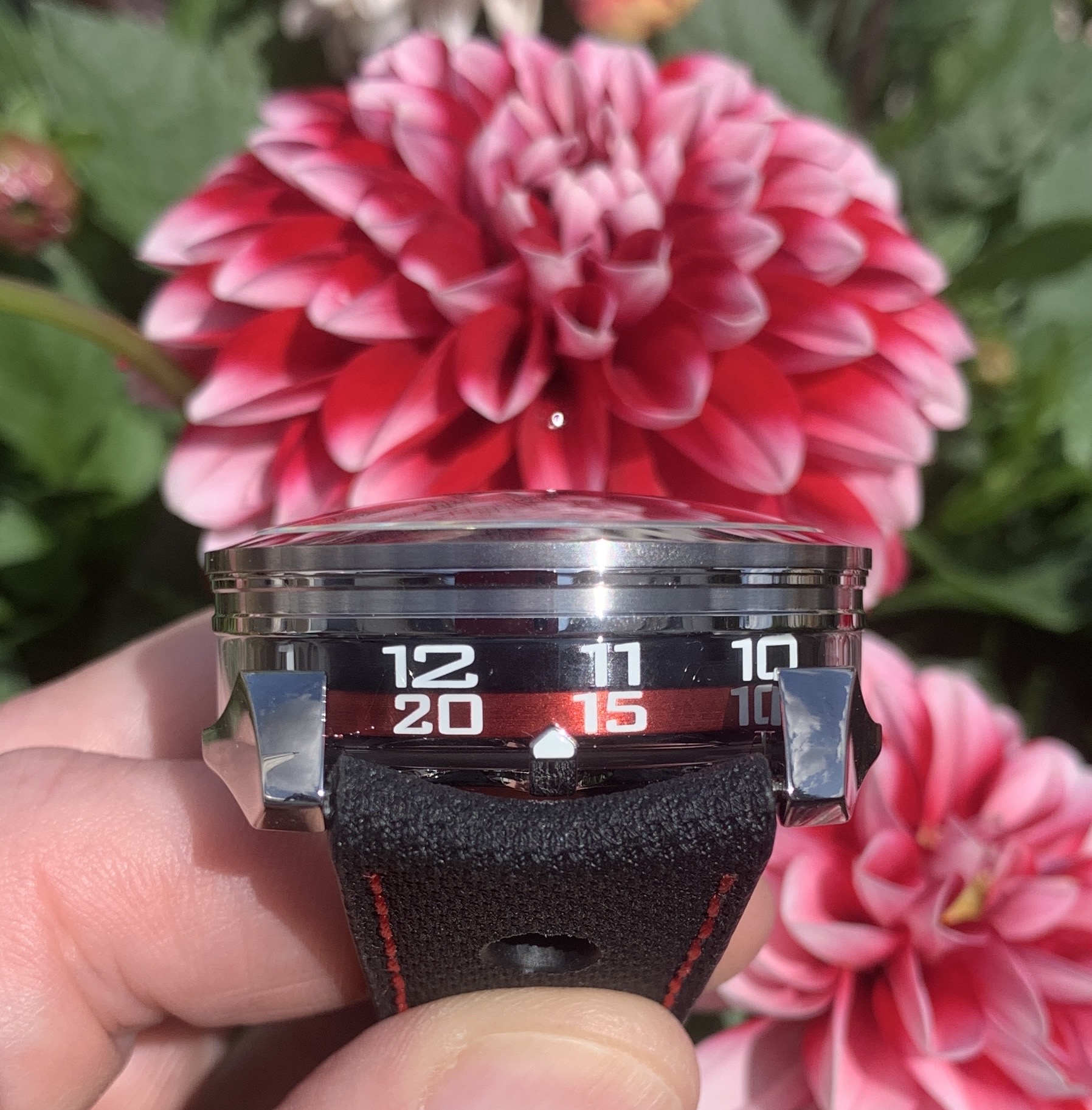 Ein schwarzes Stunden- und ein rotes Minuten-Band sind dafür zuständig, die Zeit wird an dem kleinen (wie die Zahlen auch ge-lume-ten) Dreieck abgelesen.