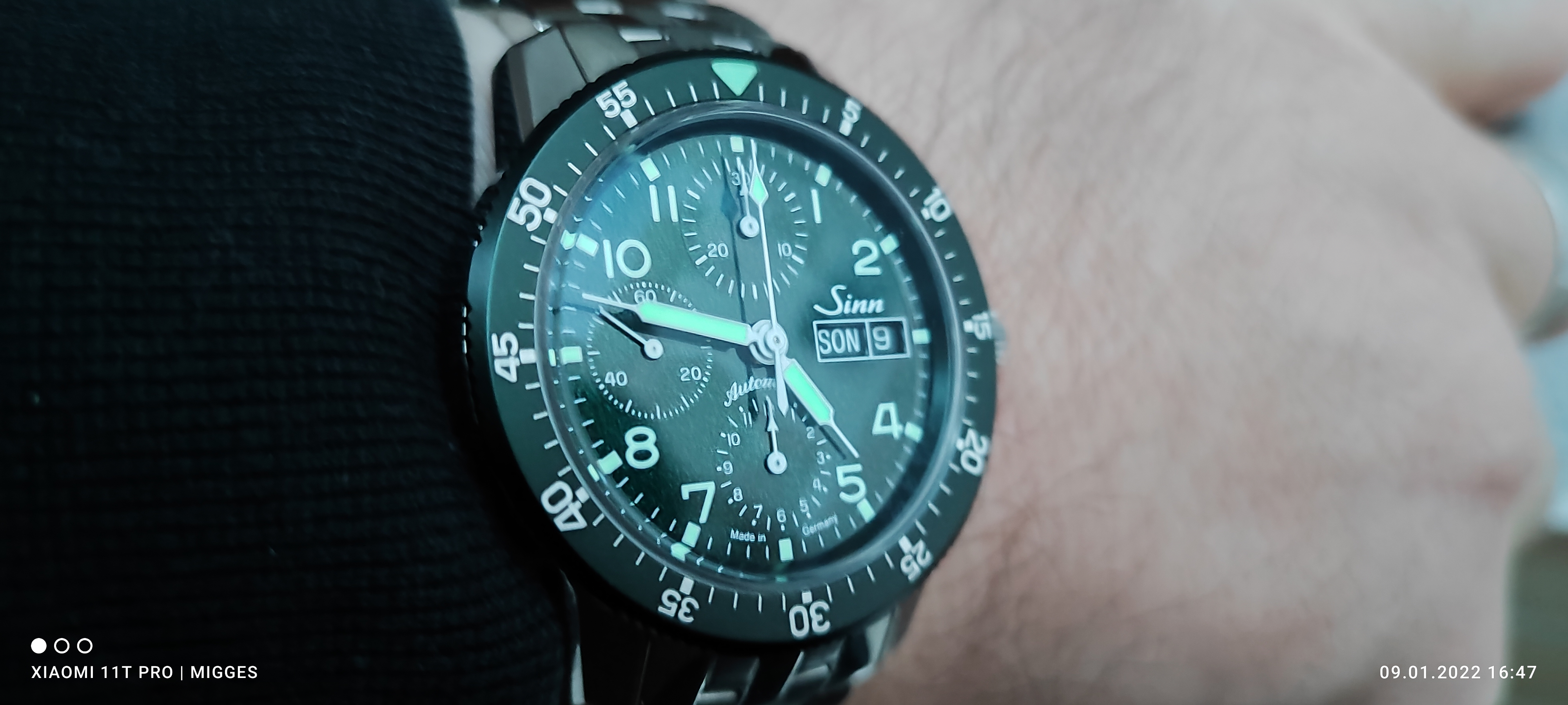 Als wir im Dezember 2020 nach Frankfurt gefahren sind , gab es eigentlich nur einen Grund. Dieser war ein Stahlband für eine Sinn 104 zu kaufen, hat auch fast gut geklappt, bis wir dann in den Showroom gelaufen sind. Dort war sie ausgestellt, diese grüne Schönheit. Haben sie dann ans Handgelenk gepackt und kurz getragen. Das wunderschöne Ziffernblatt hat uns dann tatsächlich so begeistert, das wir uns kurzum entschieden haben, sie zu kaufen.
