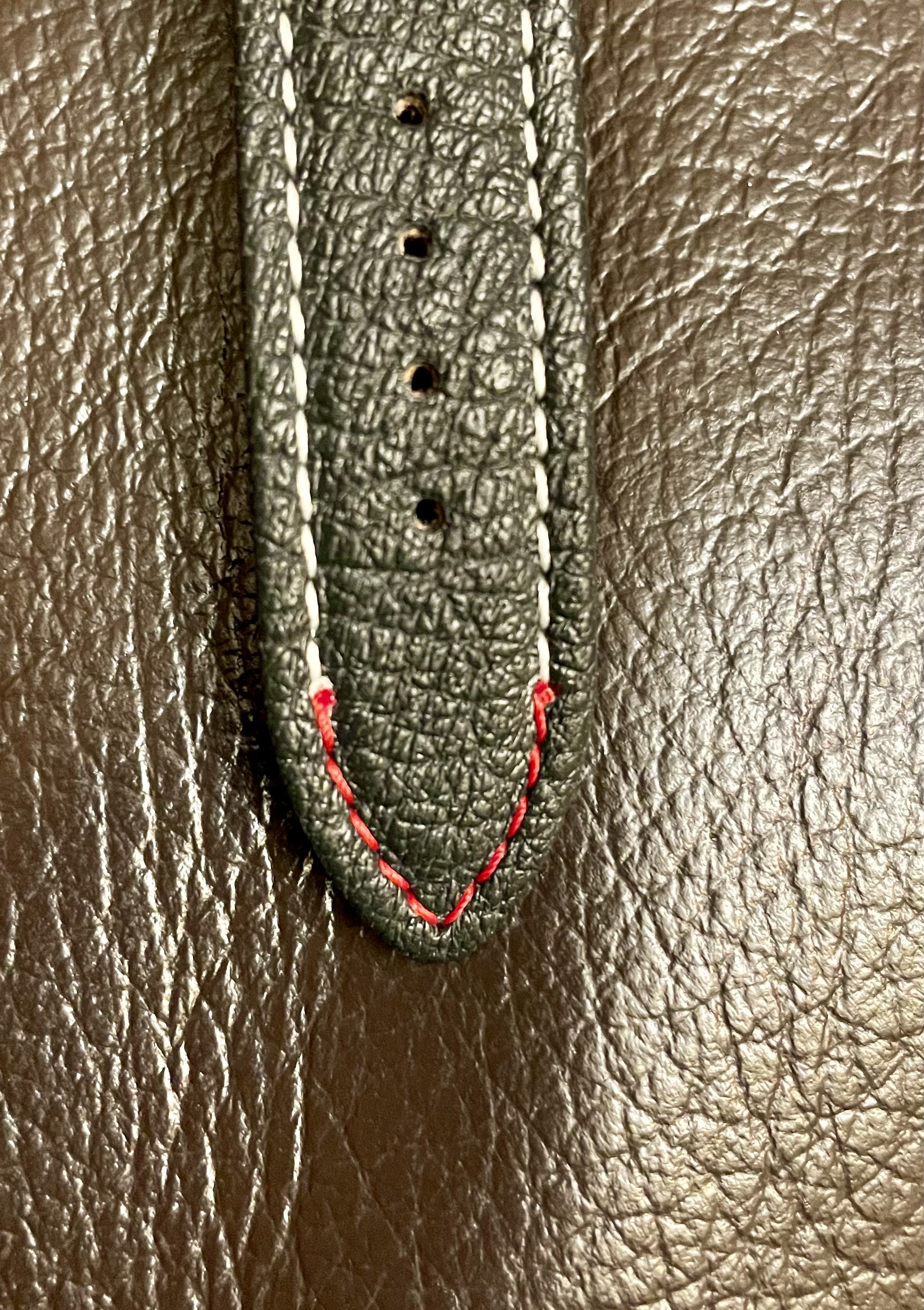 Erst mal das grüne Krötenlederband abgemacht und ein schwarzes Vintageleder mit beigem Stitch dran.