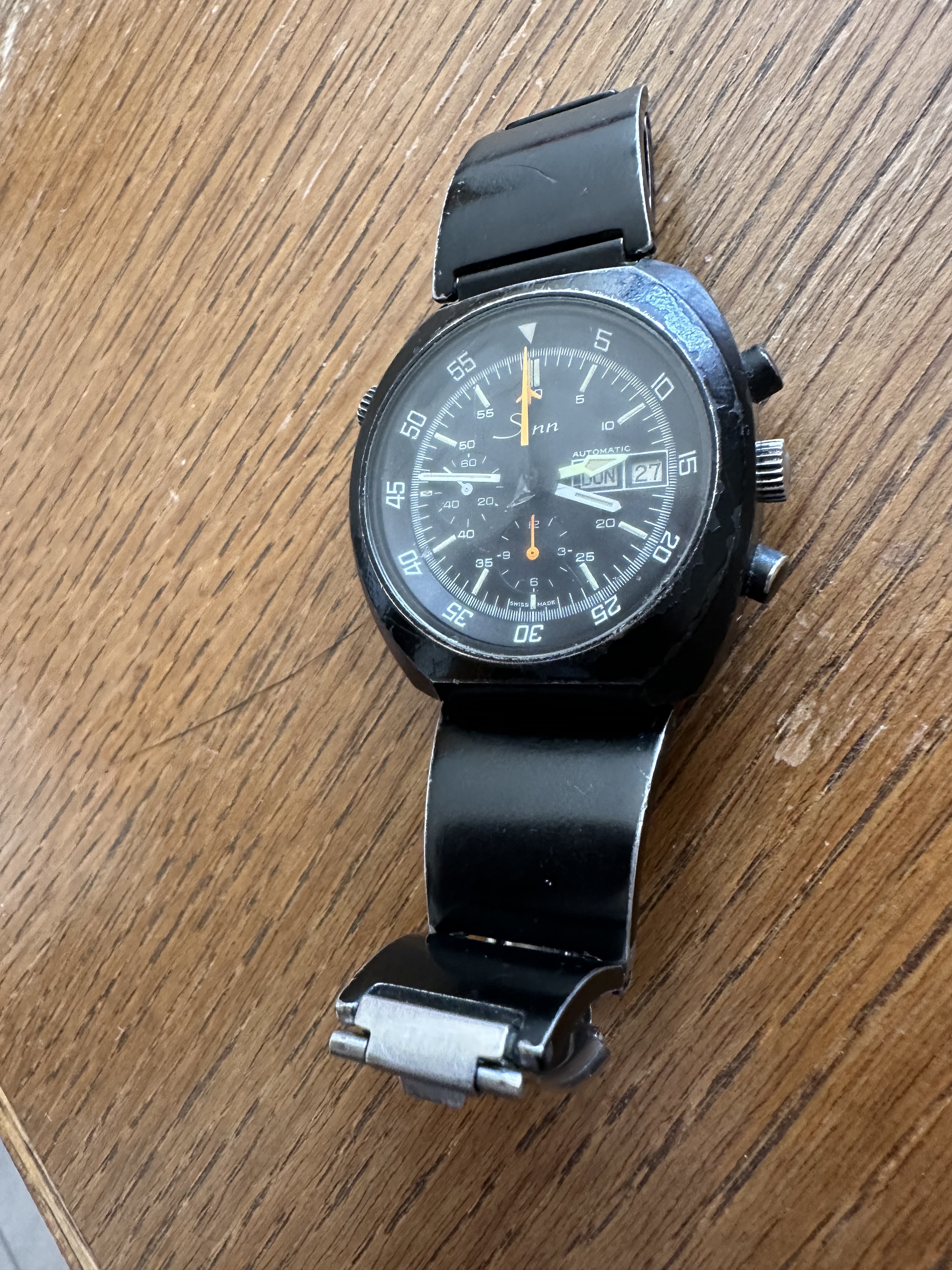 Hi Leute, wir haben im Nachlass des verstorbenen Vaters/Schwiegervater einen Sinn-Chronographen gefunden. Die Uhr muss länger gelegen haben, sie lief aber klaglos an und alle Tasten waren bedienbar. Die schwarze Beschichtung ist etwas lädiert. Der Chronograph wirkt aber sehr wertig. Kann mir dazu jemand was sagen?