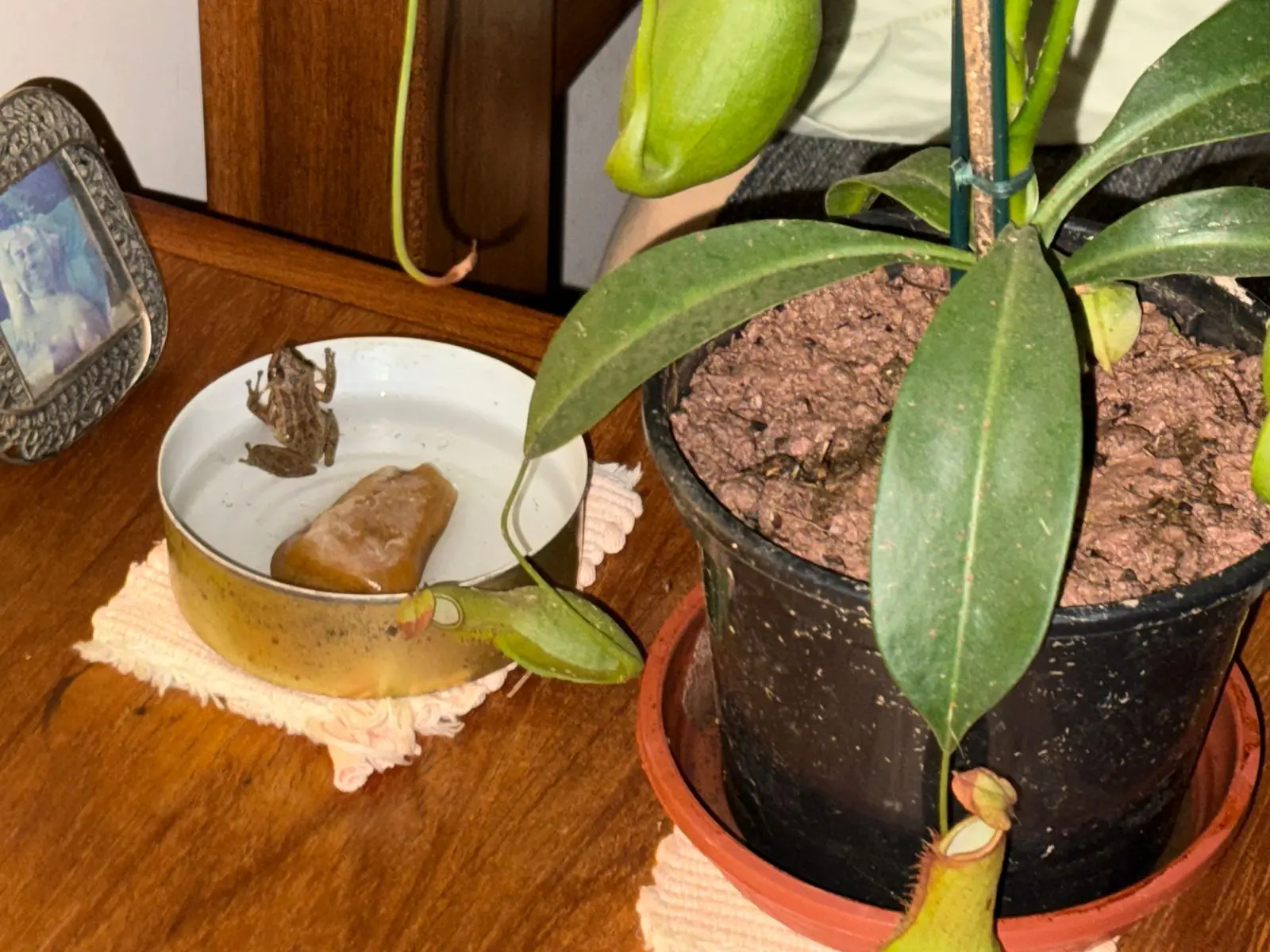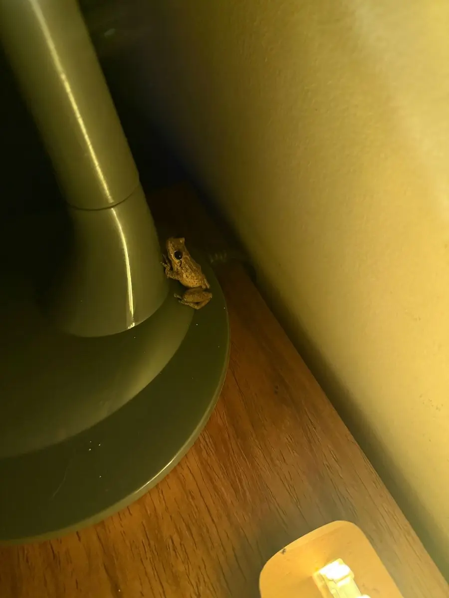 Seit über zwei Monaten ist "Fritz", ein Minifrosch von ca. 1,5 - 2 cm Länge, zum "Haustier" ernannter Bewohner des Schlafzimmers. Ich habe ihm extra einen kleinen Pool spendiert, den er jede Nacht ausgiebig nutzt, ansonsten aber mit unglaublicher Geduld an einer Dauerlichtquelle auf Beute, kleine fliegende Insekten, lauert. Er scheint sich sehr wohl zu fühlen und hat dauerhaftes Bleiberecht. Tagsüber schläft er in seinem Versteck hinter dem Nachttisch.