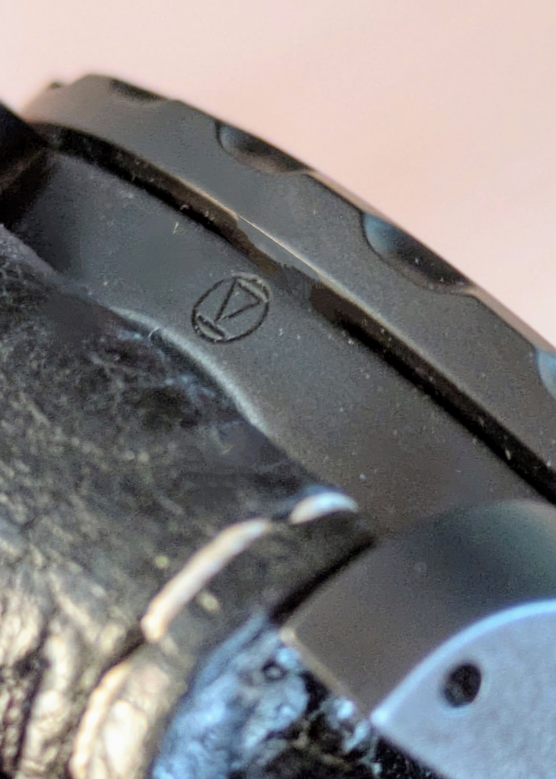 Krone verschraubt auf vier Uhr und mit Sinn S geprägt