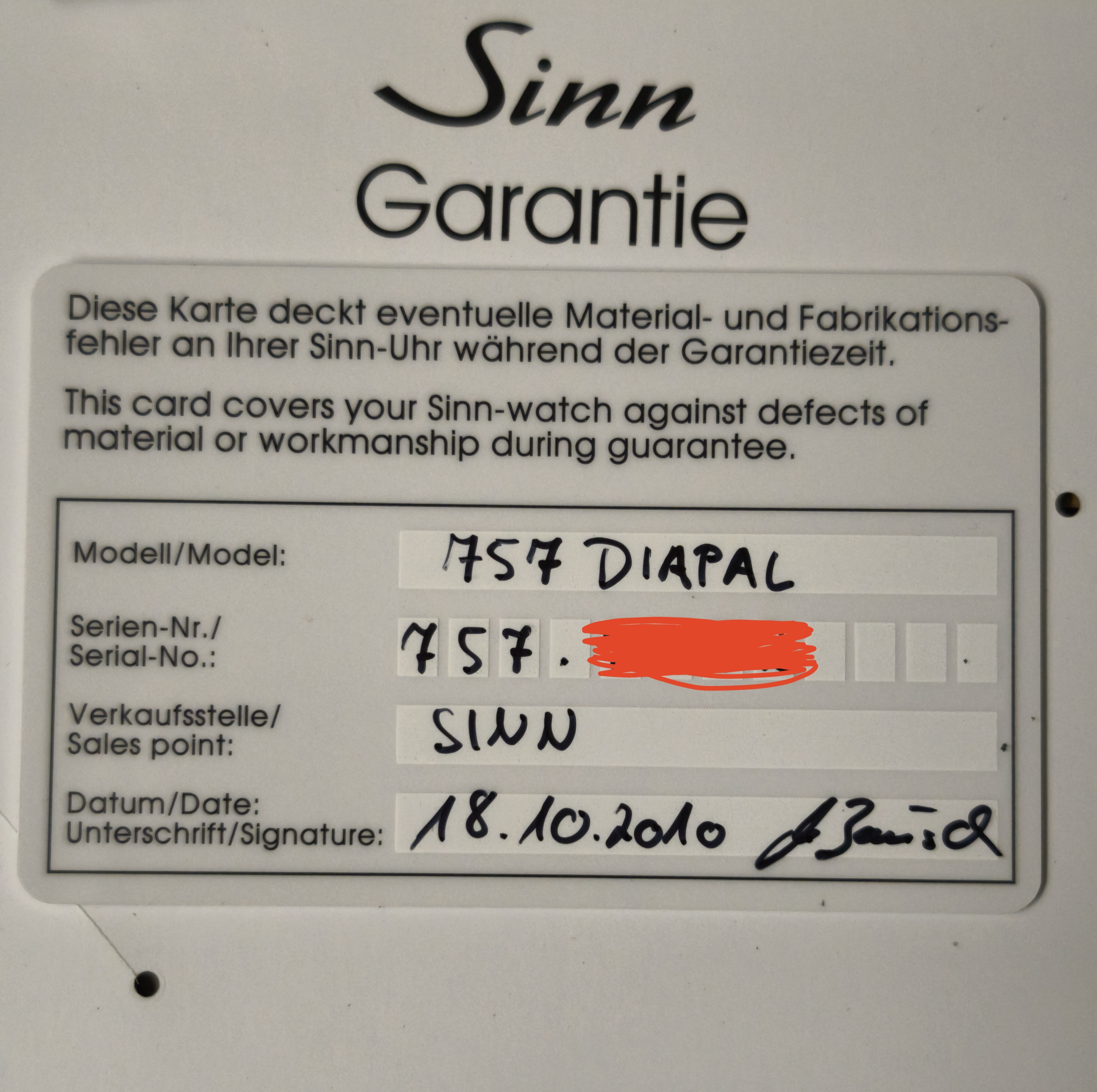 Sinn 757 Diapal aus 2010. In meinem Besitz keine Revision genossen, bei Sinn ist auch nichts hinterlegt.