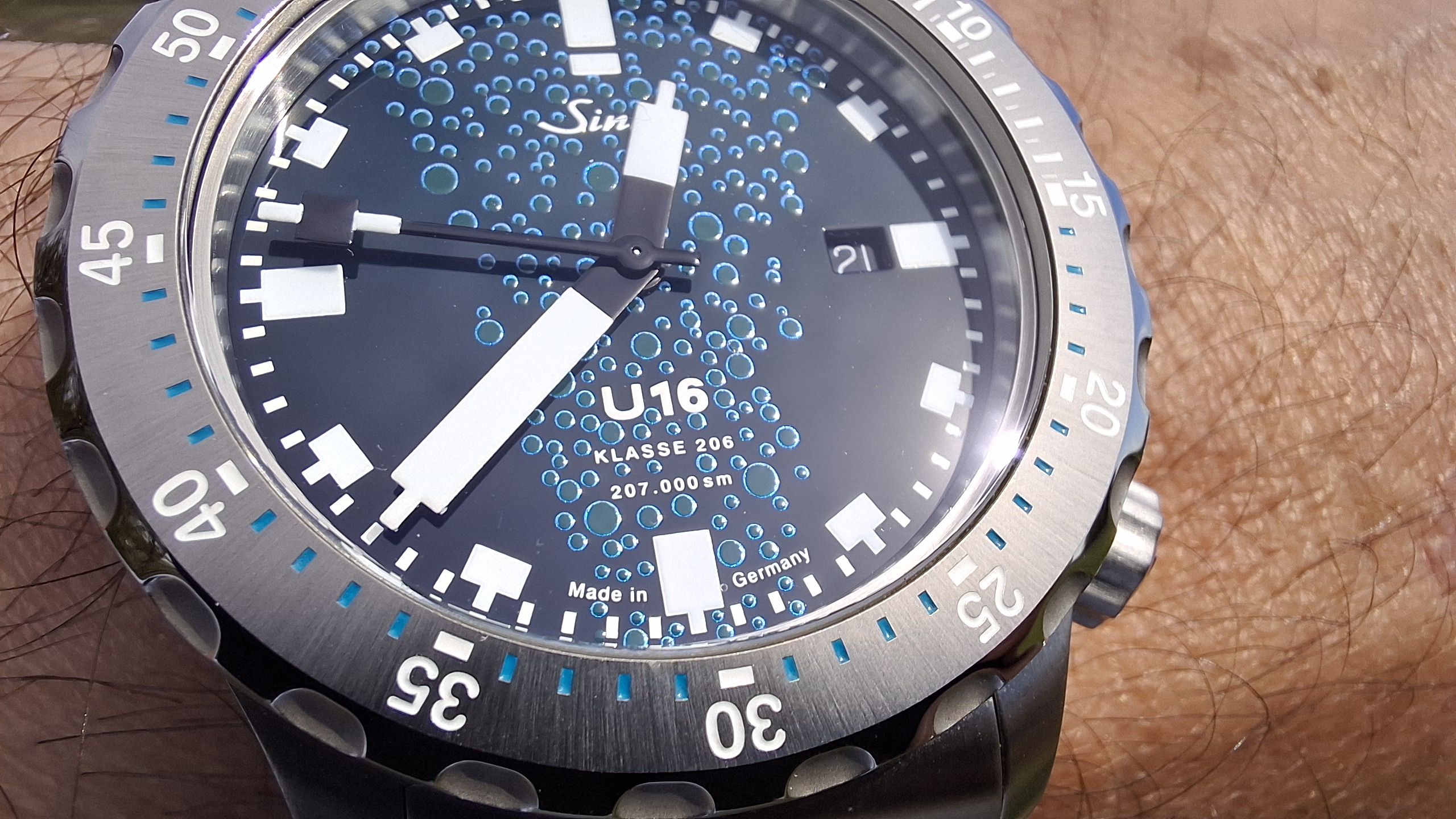 Am Mittwoch vergangener Woche dann die erlösende Nachricht aus dem Depot: Ihre U 16 ist abholbereit. Also Terminkalender befragen, etwas Zeit freischaufeln, ab auf die Vespa und zum Depot. Leider waren die Folgetermine nicht dazu geeignet, das schöne Stück sofort an den Arm zu legen, also warten bis zum nächsten Tag. Uhr einstellen, Armband kürzen, anlegen und bestaunen. Makelloses Finish, perfekt sitzende Bandanstöße, ein Verschluß der Sinn würdig ist und ein Zifferblatt das seines Gleichen sucht. Seit dem ist sie nicht mehr vom Arm gekommen.