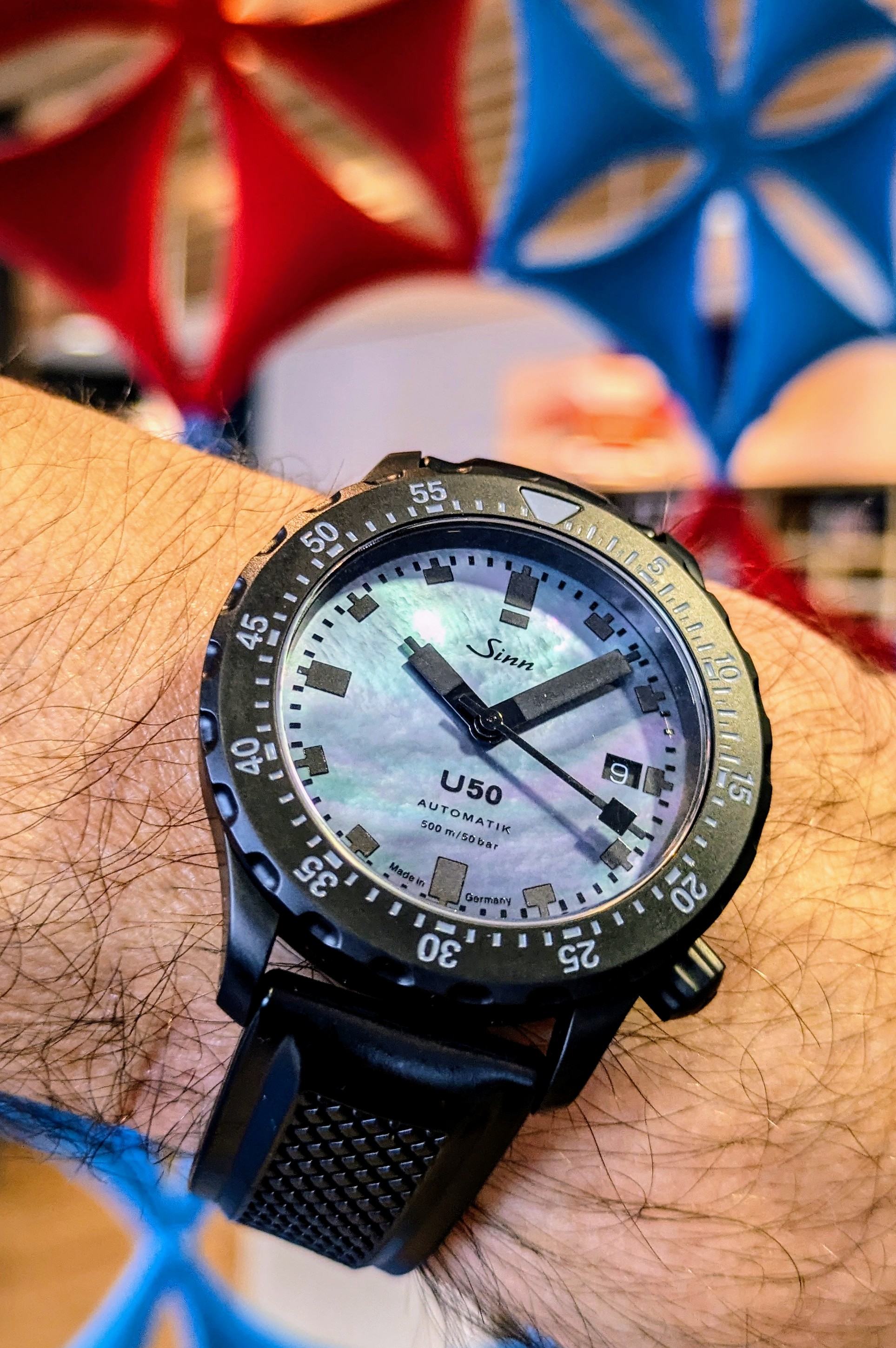 Die Uhr kommt koplett mit Box, Papieren etc. und an einem neuen ungetragenen SINN Kautschuk mit Dornschließ Black.