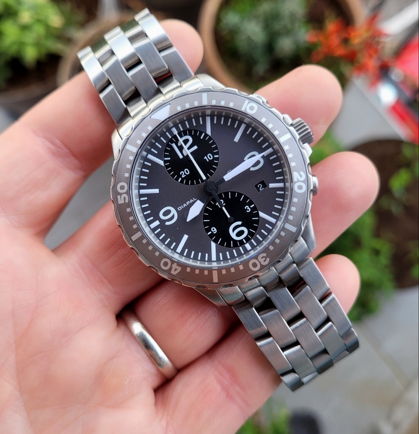 Watch is in beautiful condition, tegimented technology does wonders (check the photos please). All on the watch functions as it should, chrono sets and resets perfectly, power reserve is strong and the watch runs stabily at cca 5-7s/day. I don't have any service info from the previous owner - bought from Germany few months ago. No screws chrono pushers and still 200m wr - just stunning.