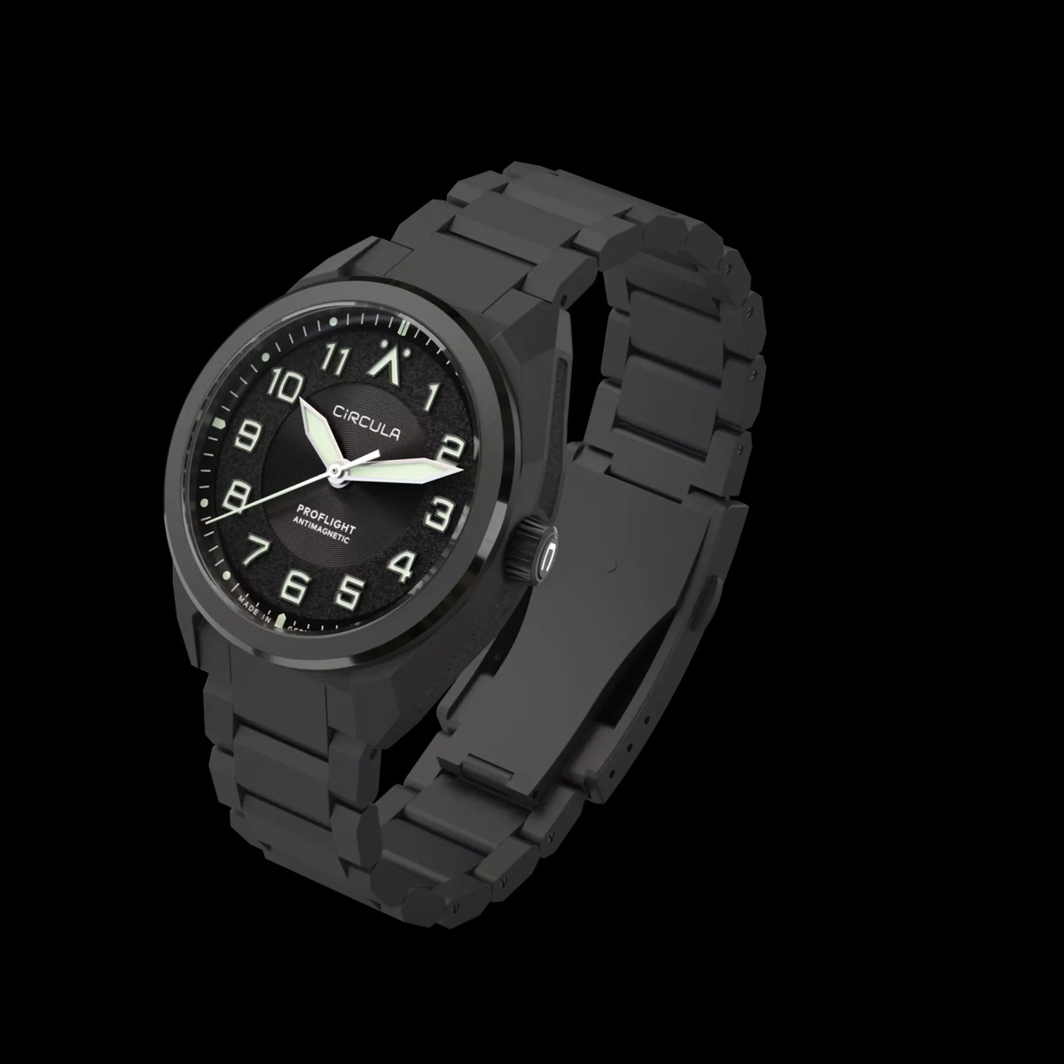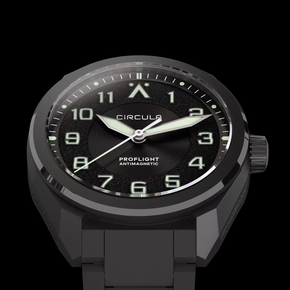 Die schwarze CiRCULA ProFlight wurde für extreme Bedingungen entwickelt. Ihr sandgestrahltes Edelstahlgehäuse – dank spezieller DLC-Behandlung kratzfest bis 1.200 Vickers – schützt das Schweizer Automatikwerk Sellita SW200-1 Elaboré zuverlässig vor äußeren Einflüssen. Ein integrierter Weicheisenkäfig macht die Uhr antimagnetisch bis 80.000 A/m, das gewölbte, innen entspiegelte Saphirglas minimiert Reflexionen und garantiert perfekte Lesbarkeit.