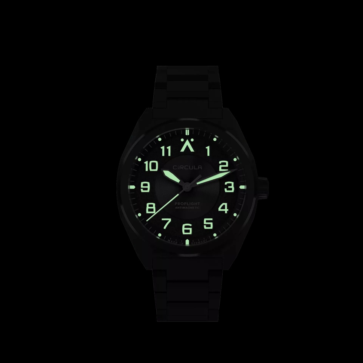 Perfekte Ablesbarkeit bei Tag und Nacht – das unverzichtbare Merkmal einer jeden Fliegeruhr. Ziffern und Zeiger der ProFlight sind mit Swiss Super-LumiNova® C3 X1 belegt, welches intensiv nachleuchtet und auch bei schlechten Lichtverhältnissen oder völliger Dunkelheit höchste Sichtbarkeit garantiert. Der speziell gestaltete Stundenzeiger mit breiter Leuchtfläche verstärkt diesen Effekt und sorgt für intuitive Orientierung auf den ersten Blick.