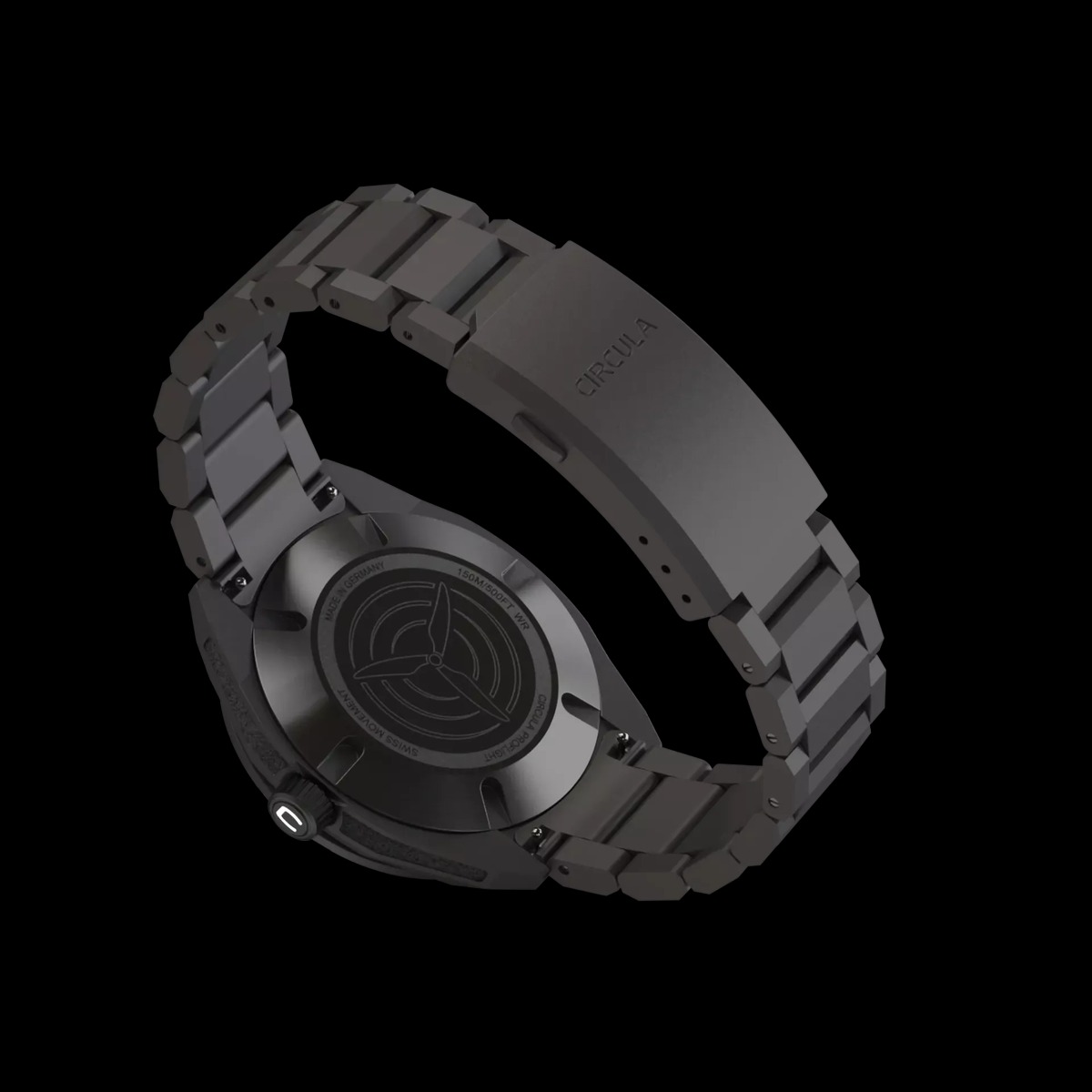 Individuell entworfene Ziffern greifen die Formensprache des Gehäuses auf und fügen sich nahtlos in das harmonische Gesamtbild ein. Im Inneren des Zifferblatts unterstreicht eine konzentrische Kreisstruktur die Dynamik des Propeller-Sekundenzeigers – ein dezentes Symbol für die Verbindung zur Fliegerei. Der gravierte Gehäuseboden mit stilisiertem Flugzeugpropeller setzt einen kraftvollen Schlusspunkt im Design.