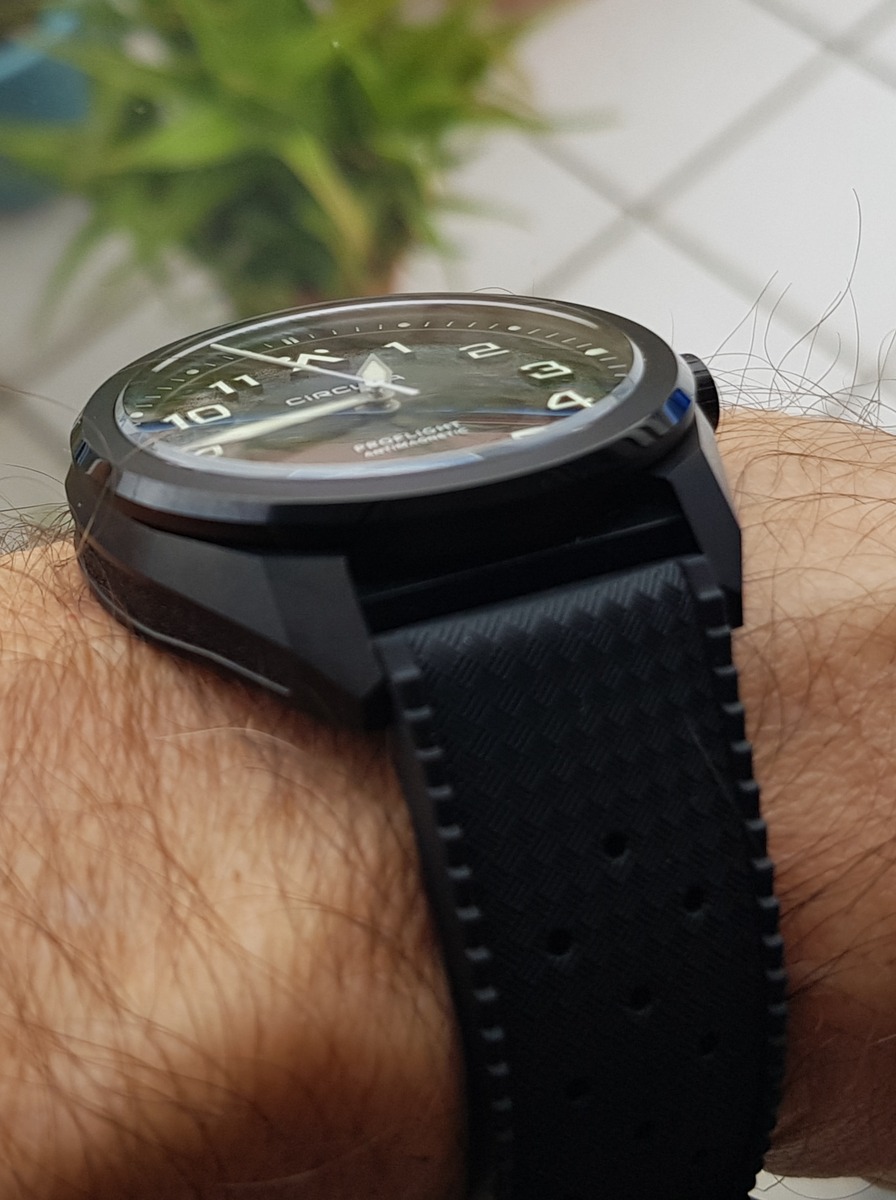 Eine wirklich tolle Optik, schöne universelle Größe mit 40mm, dadurch leicht und bestens ablesbar. Mit einem markantem, eigenständigem Design mit dem recht aufwendigen Gehäuse mit Kanten, seitlichen Ausfräsungen, Rundungen und Facetten in matt DLC mit einer schwarz polierten Lünettenfase um das entspiegelte Saphirglas. Allein das aufwendige Zifferblatt mit den inneren Rillen im Schallplattenlook und einer groben Struktur außen sowie den darauf applizierten, formschönen, großen Leuchtziffern, dem V-förmig-offenen Leuchtdreieck bei 12 Uhr sowie den fetten metallisch gerahmten Schwertzeigern ist ungewöhnlich-auffällig aber gut gemacht und nahezu perfekt ablesbar.