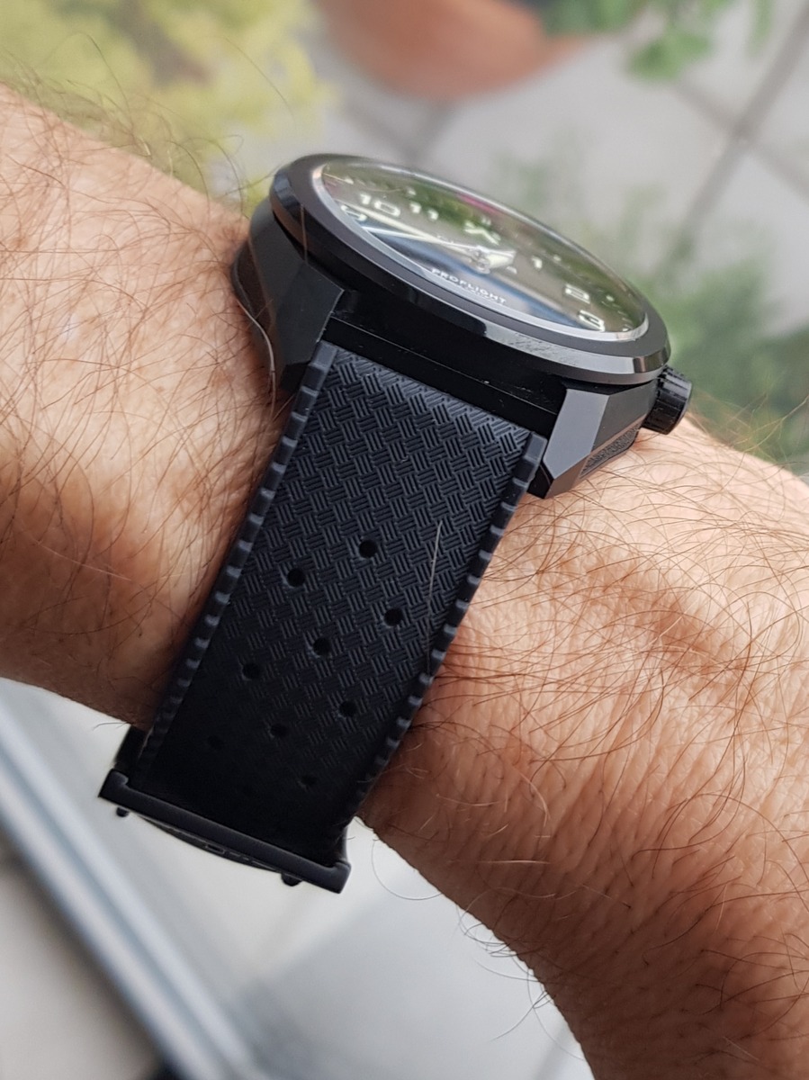 Das schwarze Tropic-Rubberband mit Schnellwechselsystem welches ich für die DiveSport nachbestellt habe, passt natürlich auch an die ProFlight (optisch sogar noch besser) und ist schon etwas sommertauglicher (Bilder unten).