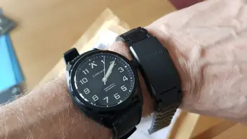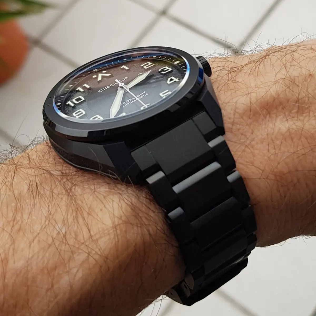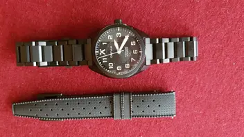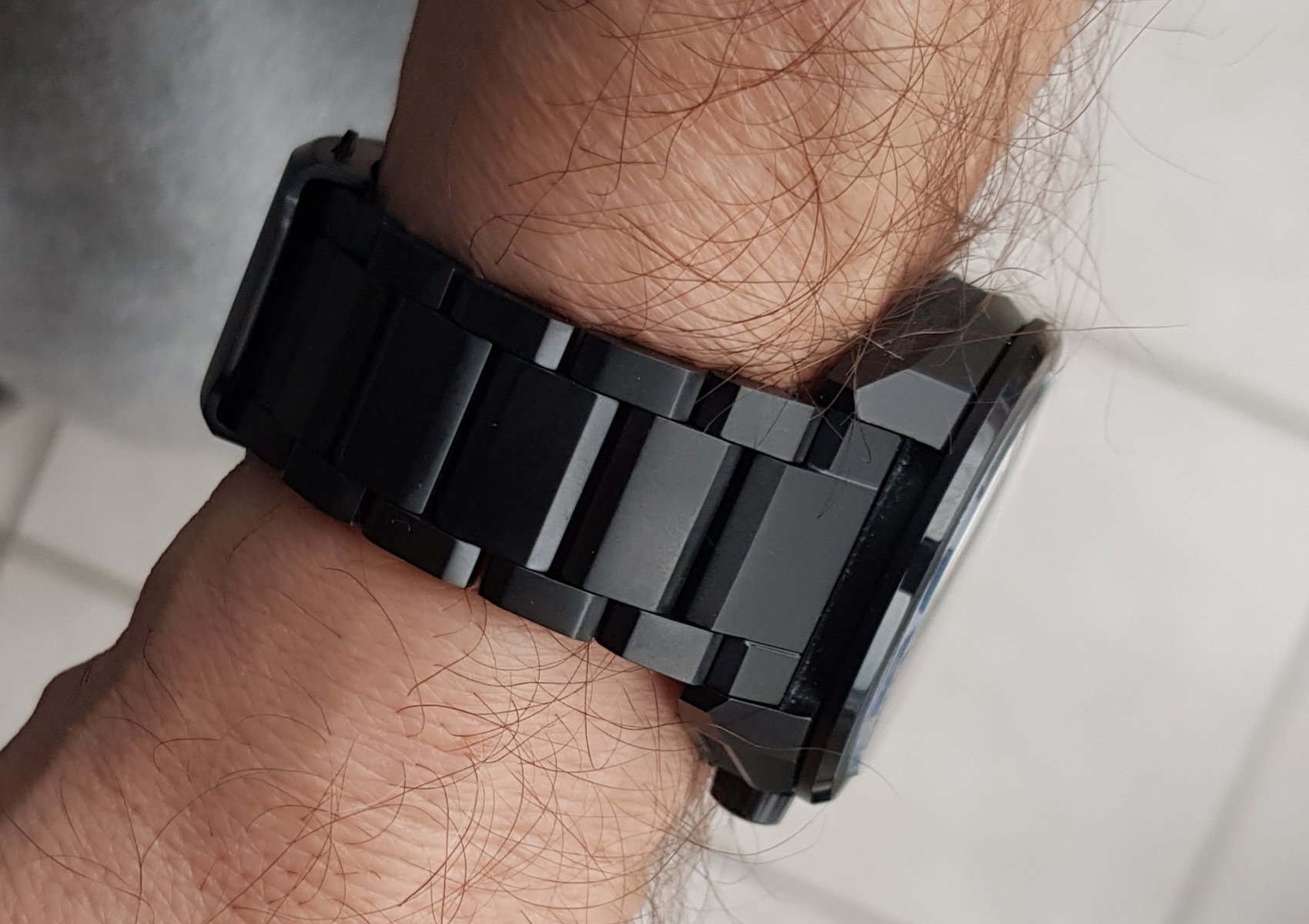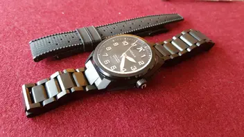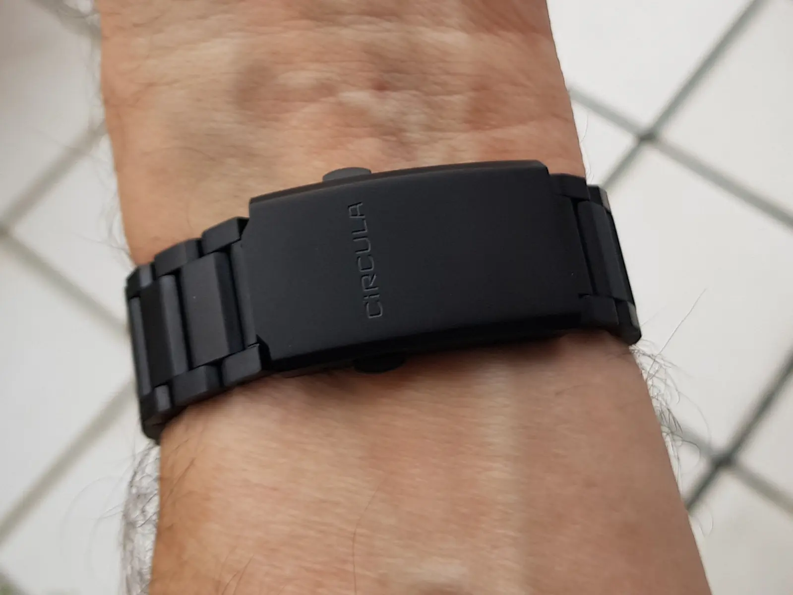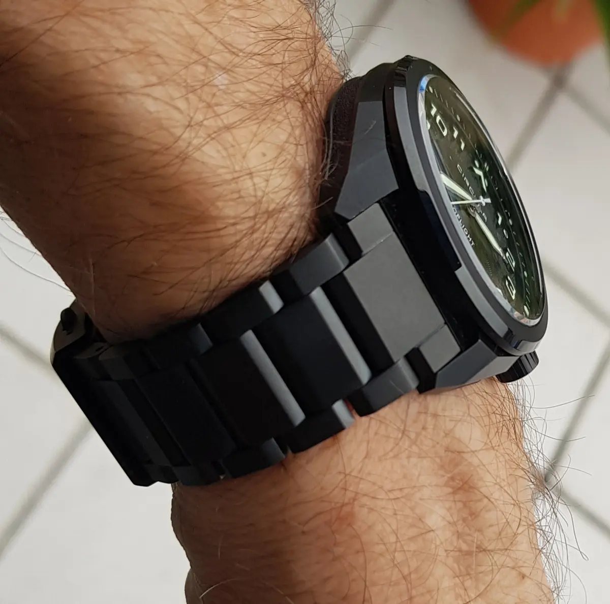 ein integriertes Proflight Stahlband, kratzfest gehärtet, schwarz PVD mit Schnellwechselstegen und 3 Feinverstellbohrungen in der Schließe.... ![]()