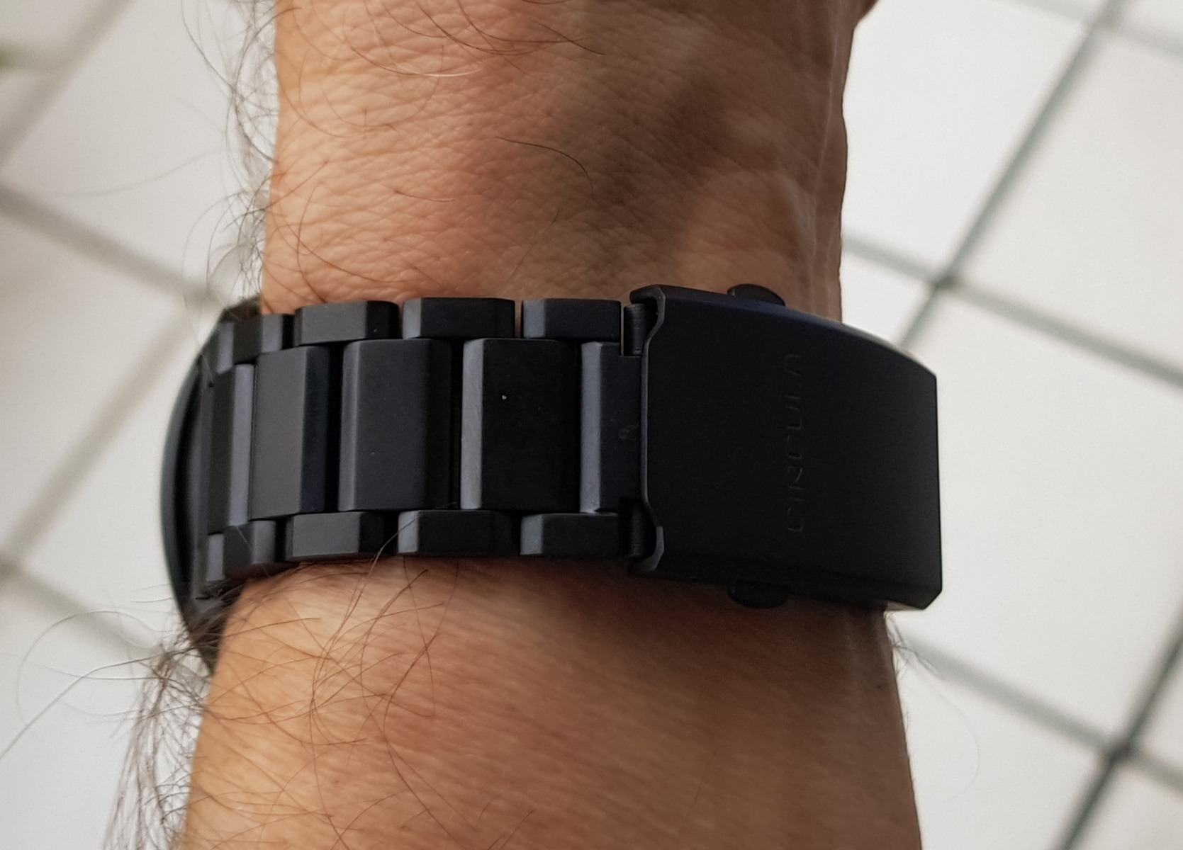 ein integriertes Proflight Stahlband, kratzfest gehärtet, schwarz PVD mit Schnellwechselstegen und 3 Feinverstellbohrungen in der Schließe.... ![]()