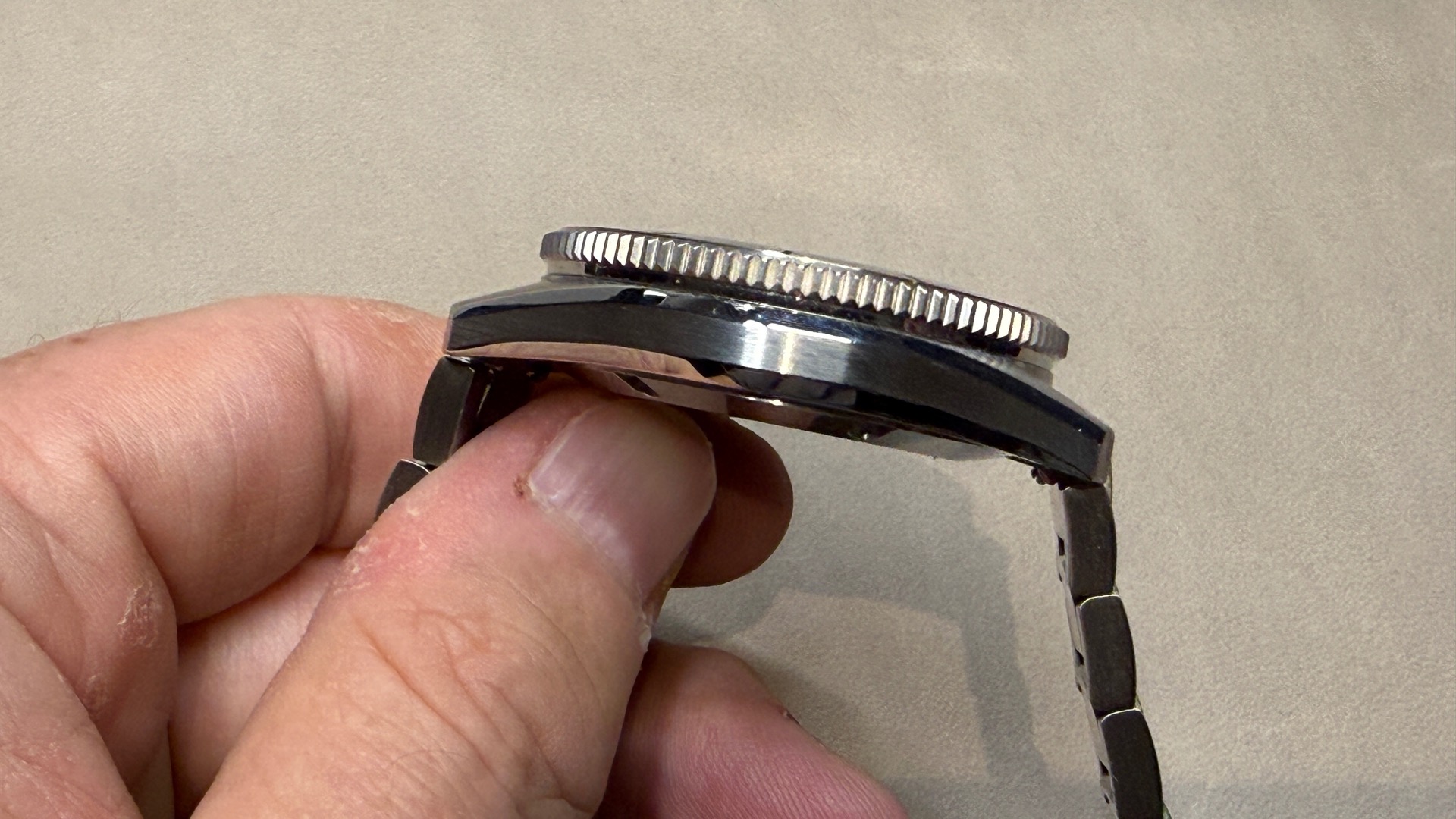 Die Uhr ist nicht neuwertig, weil ich sie getragen habe. Ich kann allerdings keine Kratzer oder Dellen finden, die man mit dem Fingernagel fühlen könnte, aber ich habe auch keine Lupe genommen.