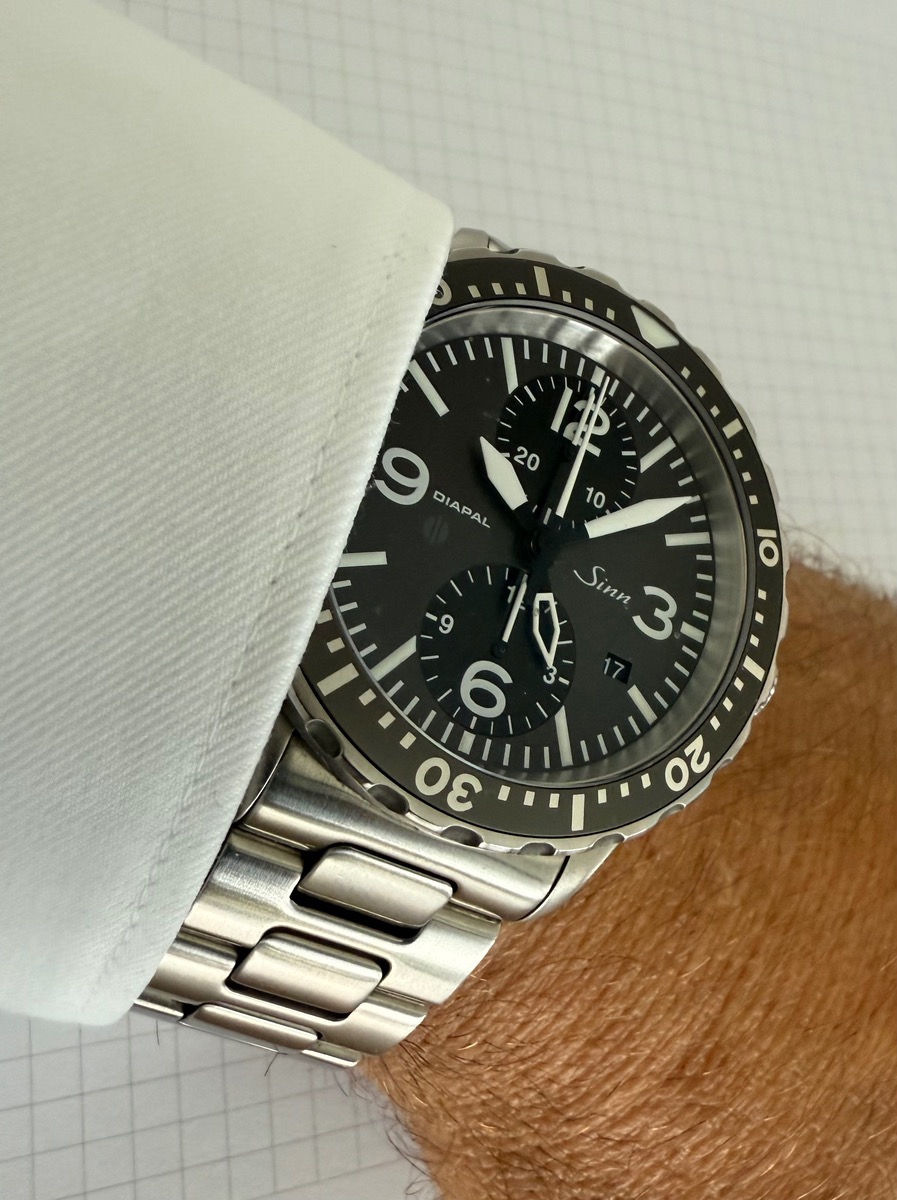 Zweigliedrig, satiniert. Das ist 100% Sinn. Das habe ich mnir mal bei Sinn machen lassen für meine 757 Diapal, die das gleiche Gehäsue-Finish hat.