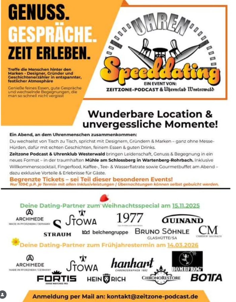 Unter dem Motto „Genuss. Gespräche. Zeit erleben.“ treffen sich in der malerischen Mühle am Schlossberg in Wartenberg-Rohrbach Uhrenfreunde, Sammler und Markenvertreter in entspannter, festlicher Atmosphäre.