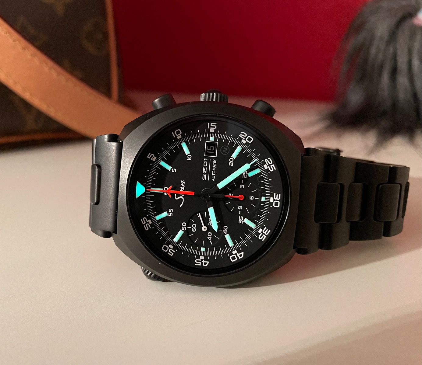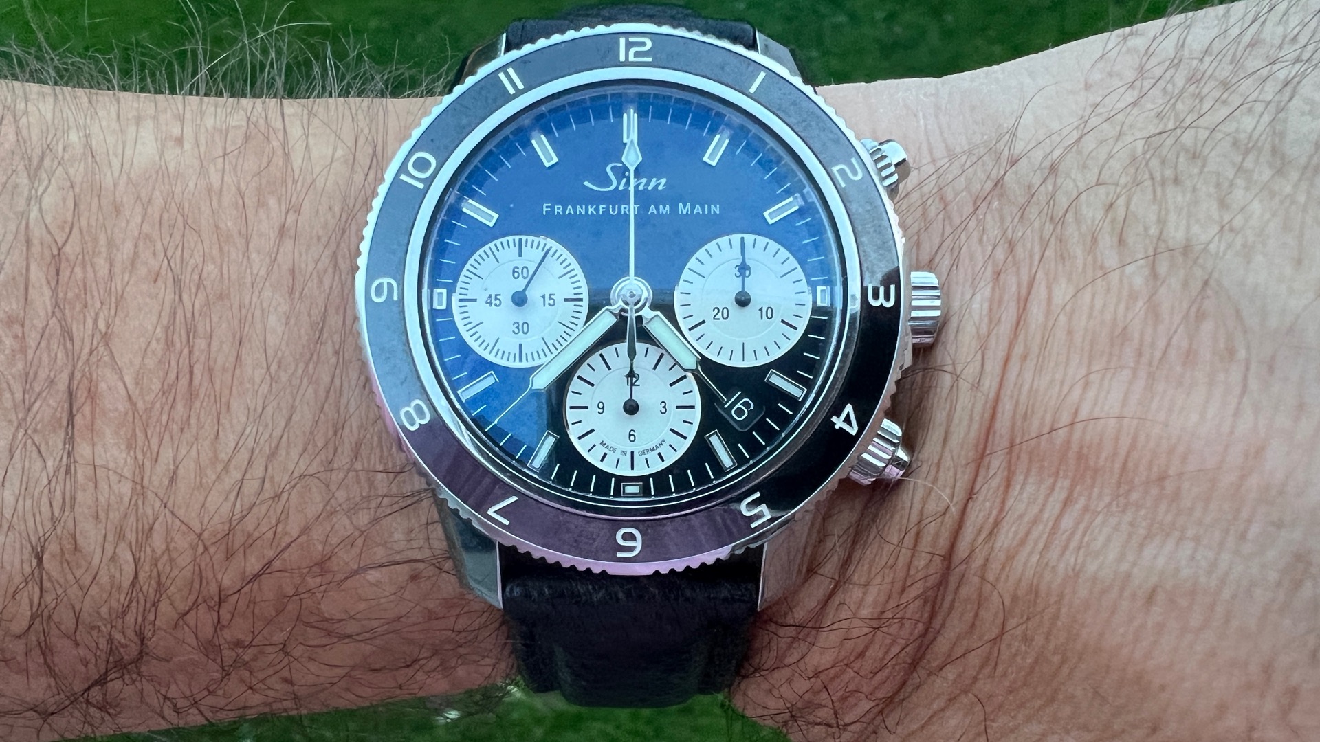 Sie hat das typische Sinn-Gesicht, ist für einen Chrono recht flach und damit trageangenehm und auch nicht so schwer wie so manch andere Sinn.