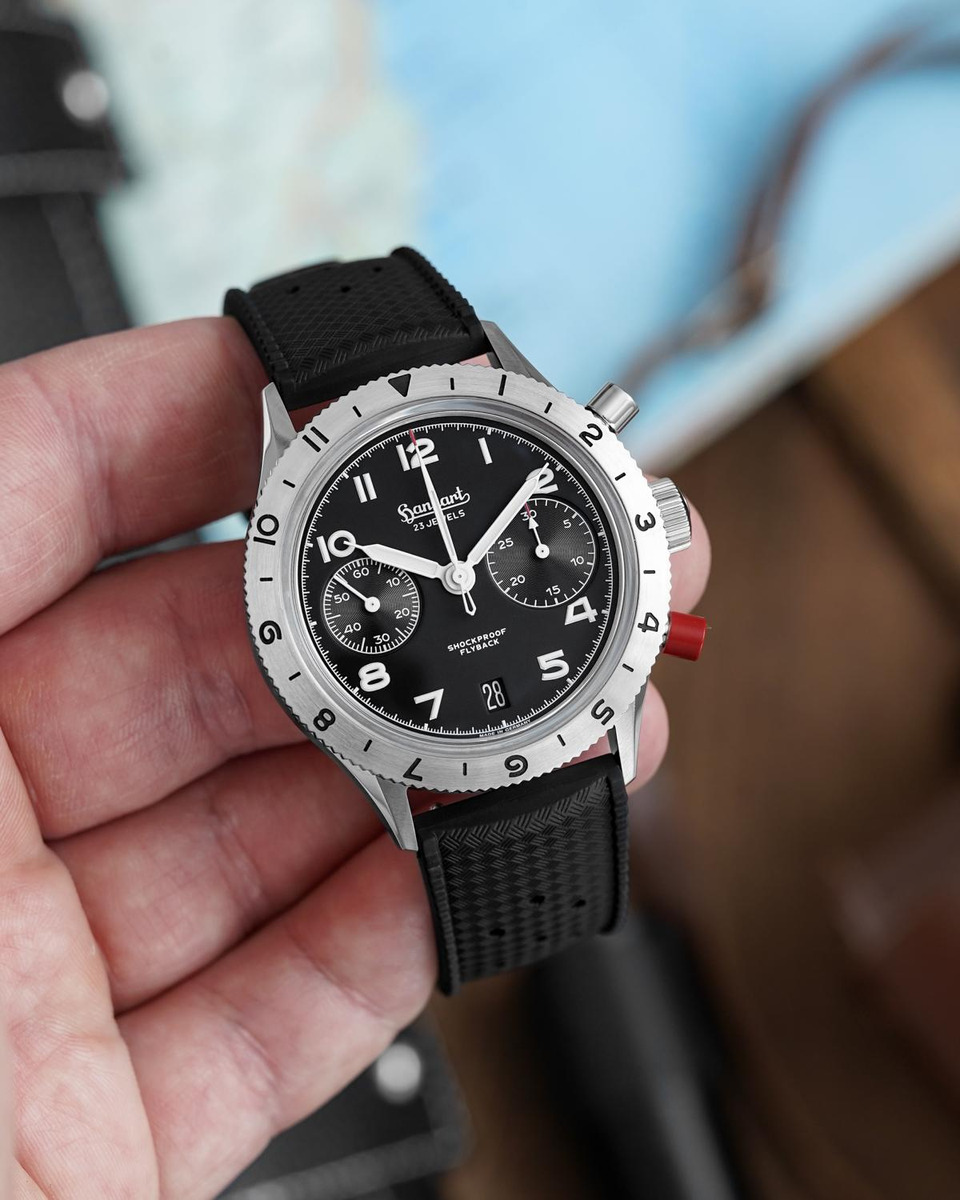 Historisch jedoch diente die rote Farbe einem praktischen Zweck: sie sollte Piloten vor einem unbeabsichtigten Rückstellen der Stoppzeit schützen – besonders wichtig bei Uhren mit Flyback-Funktion, die ein sofortiges Neustarten der Zeitmessung mit nur einem Tastendruck ermöglichen.