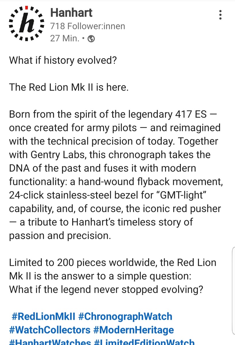 „Was wäre, wenn die legendäre 417 ES, einst für Bundeswehrpiloten geschaffen, einen Nachfolger mit erweiterten Funktionen bekommen hätte?“ Mit der neuen Red Lion Mk II beantwortet Hanhart genau diese Frage. Gemeinsam mit TGV, Gründer des berühmten Youtube-Kanals „The Urban Gentry“ und Designstudios „Gentry Labs“, entstand ein Chronograph, der die funktionale DNA der historischen 417 ES aufgreift und weiterentwickelt – ein Zeitmesser, mit vielen Funktionen geschaffen für den Alltag.