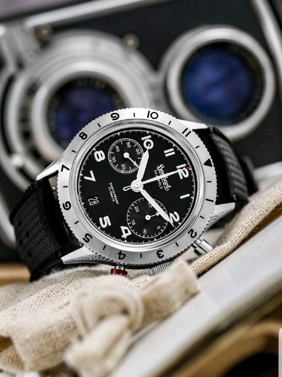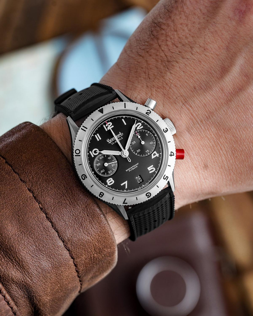 Historisch jedoch diente die rote Farbe einem praktischen Zweck: sie sollte Piloten vor einem unbeabsichtigten Rückstellen der Stoppzeit schützen – besonders wichtig bei Uhren mit Flyback-Funktion, die ein sofortiges Neustarten der Zeitmessung mit nur einem Tastendruck ermöglichen.