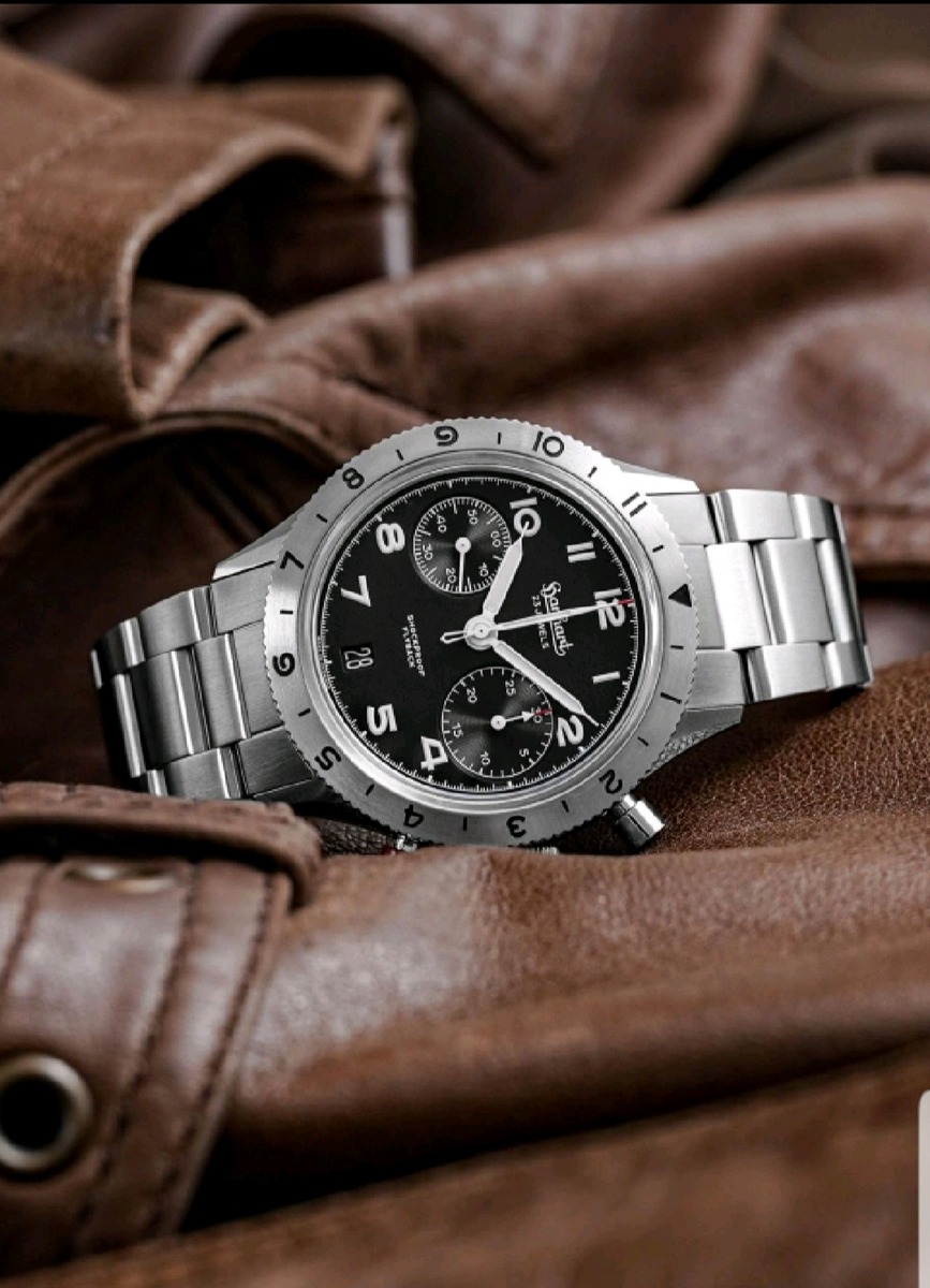Mit „Big Eye“ bei 3 Uhr und kleinem Minutenstoppzeiger mit Super-Luminova® und roter Zeigerspitze wird die Ablesbarkeit der Stoppminute signifikant erhöht. Die präzise rastende 24-Klick, 12-Stunden Edelstahllünette ermöglicht das einfache und schnelle Einstellen einer zweiten Zeitzone, auch als „GMT-light“ bezeichnet, ohne die Funktionalität und Ablesbarkeit der Uhr zu beeinträchtigen. Das Datum bei 6 Uhr und ein Flyback-Werk mit Schaltrad komplettieren den Chronographen und machen ihn zum perfekten Begleiter - vom Cockpit bis ins Büro.