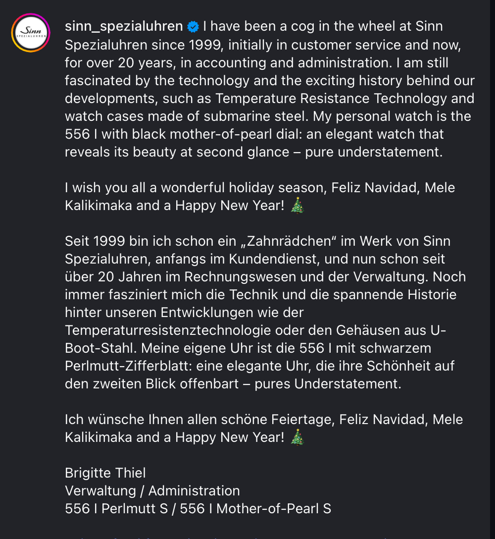 Von mir geht ein großes Dankeschön an Silvia Winter und das ganze Team für den herzlichen Empfang und die tolle Einarbeitung. Ich freue mich wirklich sehr darüber, nun bei Sinn Spezialuhren mitgestalten zu dürfen! [Annabelle Klute]