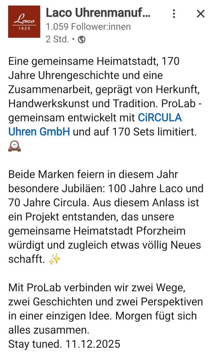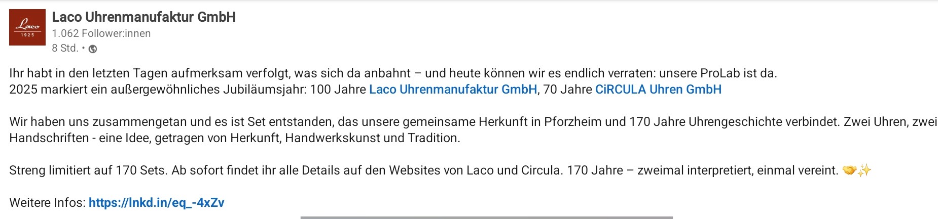 Eine gemeinsame Heimatstadt, 170 Jahre Uhrengeschichte und eine Zusammenarbeit, geprägt von Herkunft, Handwerkskunst und Tradition. ProLab - gemeinsam entwickelt mit CiRCULA Uhren GmbH und auf 170… | Laco Uhrenmanufaktur GmbH