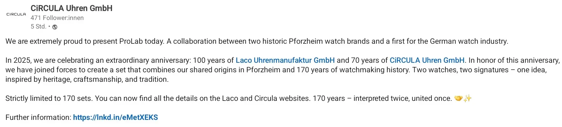 Eine gemeinsame Heimatstadt, 170 Jahre Uhrengeschichte und eine Zusammenarbeit, geprägt von Herkunft, Handwerkskunst und Tradition. ProLab - gemeinsam entwickelt mit CiRCULA Uhren GmbH und auf 170… | Laco Uhrenmanufaktur GmbH